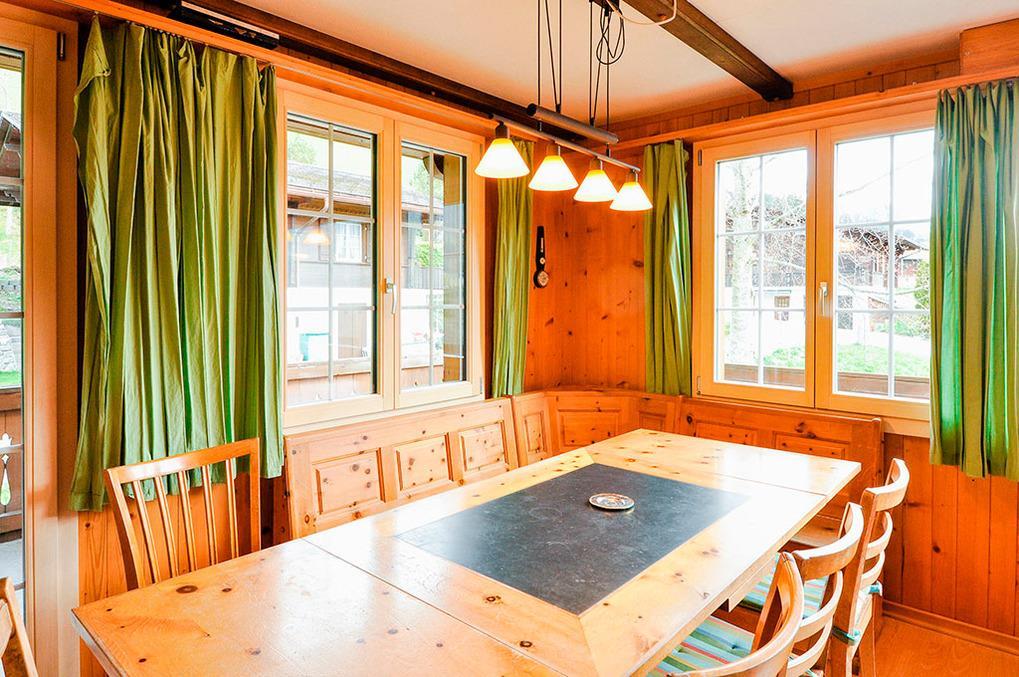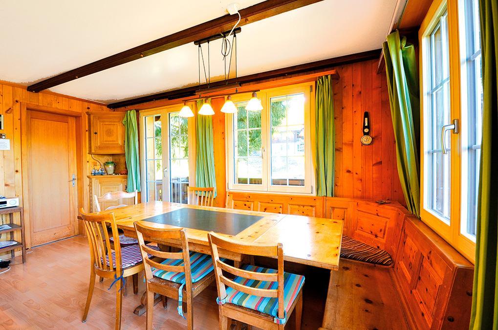 Haus: Sehr schönes Schweizer Holzchalet mit Kamin. 7-Zimmerhaus mit ca. 110 qm Wohnfläche. Wohnlich-gemütliche Einrichtung. Internetzugang über W-Lan (Gebühr). E-Nachtspeicher- und Fußbodenheizung. Warmwasser über E-Boiler. Waschmaschine. Nichtraucherhaus. Sonnen-Terrasse, Balkon mit Sitzmöbeln. Garage.