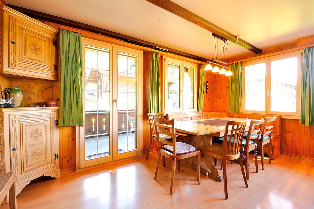 Haus: Sehr schönes schweizer Holzchalet mit 2 Ferienwohnungen. Ruhige Lage oberhalb des Ortes, umgeben von Almwiesen. Blick ins Tal und auf die umliegende Bergwelt. Schöne Wanderwege beginnen direkt vor der Haustür! Ortsmitte mit Freibad, Bergbahnen 2,9 km.