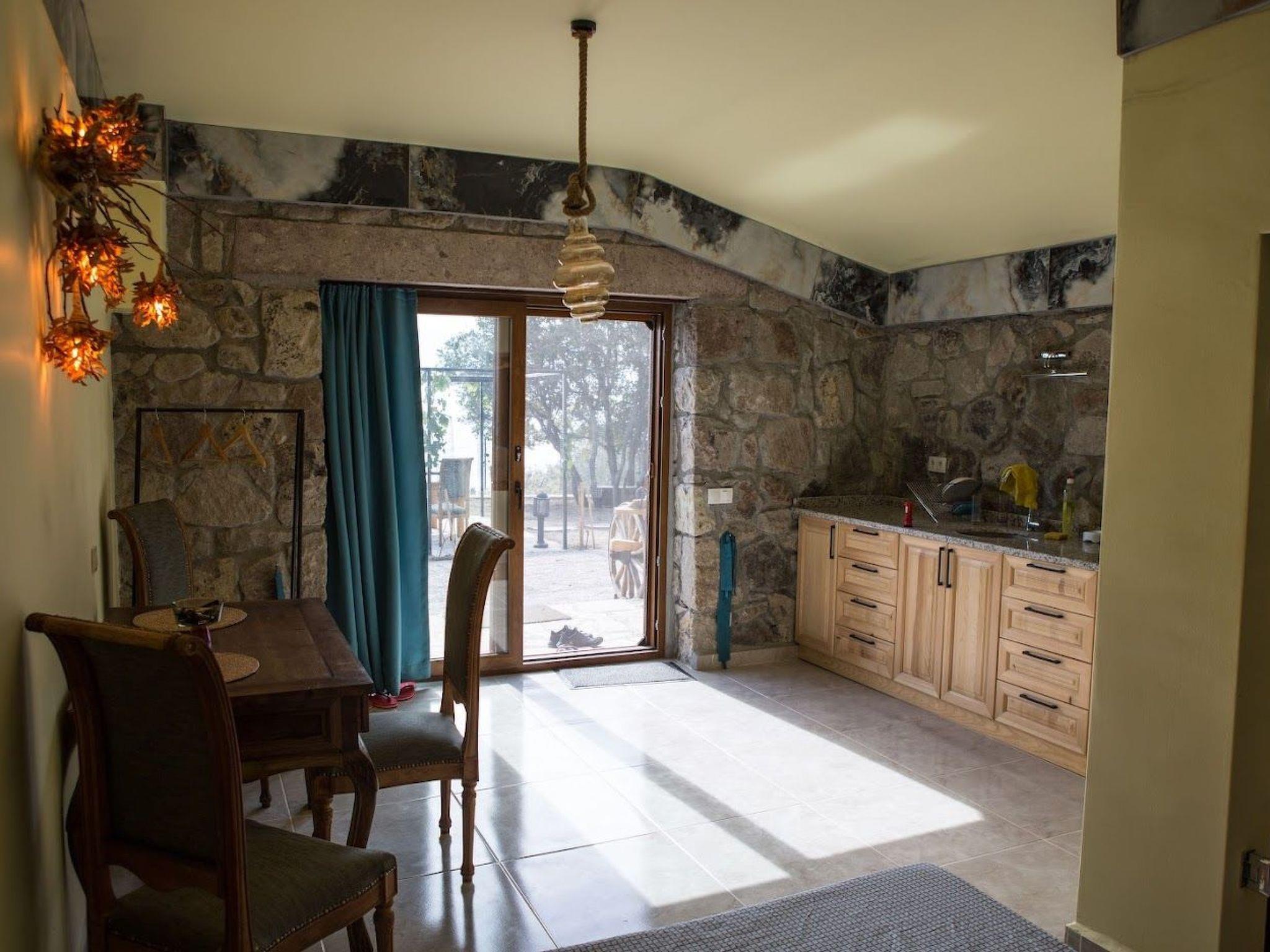 The guest house was newly and elaborately built in 2023. It is located on a gentle slope and could therefore be built into this slope. Except for the front façade made of natural stone, the house lies in the ground. The house therefore has a pleasant climate. The roof is also made of earth and houses a roof garden with a terrace. The architecture is extraordinary (see photos). Some say it is modern and archaic at the same time. It has 2 rooms. Each room has a double bed, a shower with toilet and a beautiful customised kitchen made of solid wood. An antique table and three matching chairs invite you to dine and so on. Each room has the same furnishings. A large light-absorbing curtain guarantees pleasant darkness even in daylight. In the cooler seasons, the rooms are heated with an air heat pump via underfloor heating.