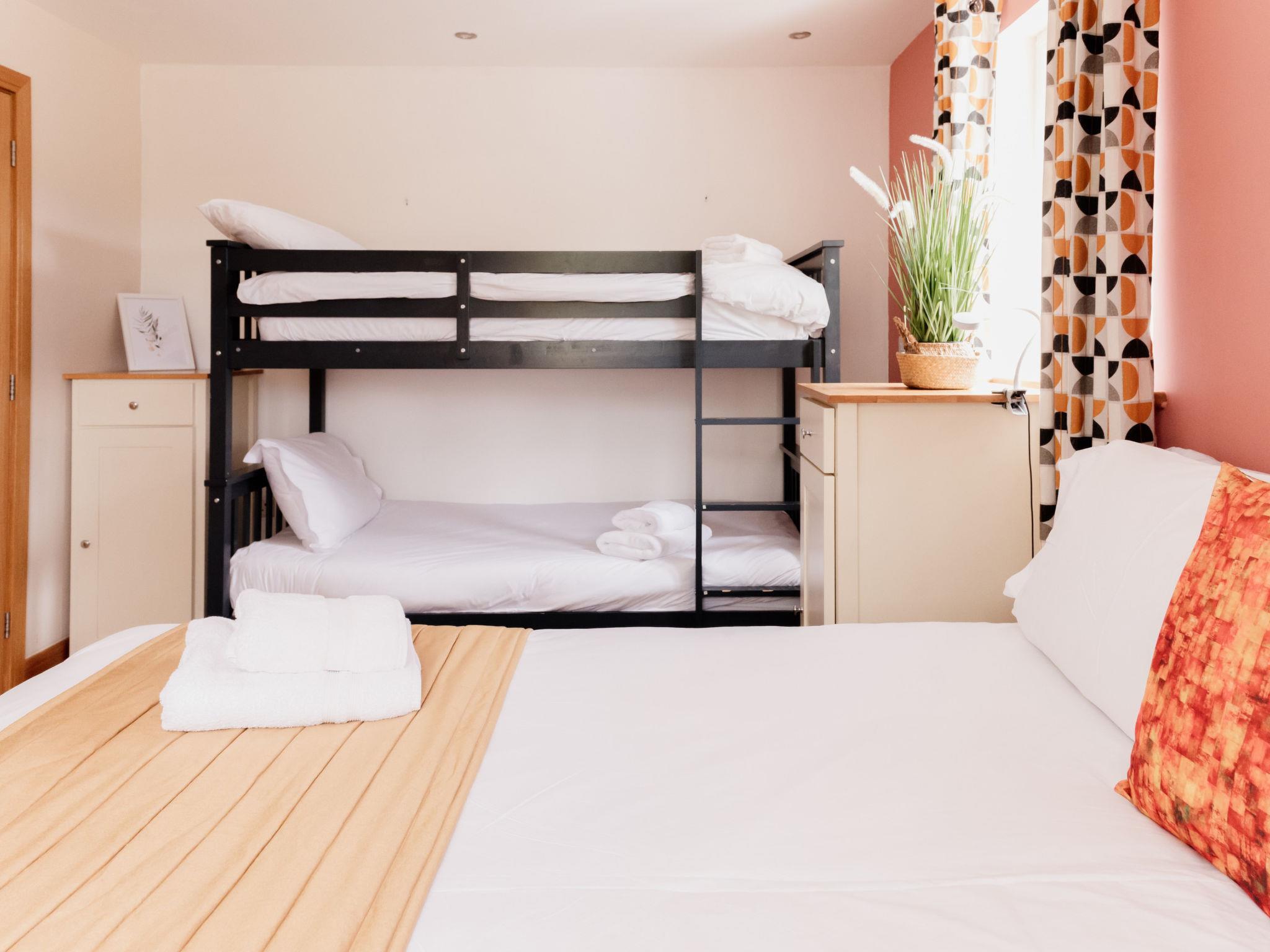 "The Welsh Barn", 11-room house 350 m2. Object suitable for 38 adults. Living room. 1 room with 1 french bed. 1 room with 3 beds and 1 french bed. 1 room with 1 bed and 2 french beds. 1 room with 2 beds and 1 french bed. 1 room with 1 french bed. 1 room with 1 x 2 bunk beds, 1 french bed. 1 room with 3 beds and 1 french bed. 1 room with 4 beds and 1 french bed. 1 room with 1 french bed. 1 room with 1 bed and 1 x 2 bunk beds. Kitchen (oven, dishwasher, toaster, kettle, microwave, freezer, electric coffee machine). Bath/WC, 9 showers/WC. Facilities: washing machine, iron. Internet (WiFi, free). Parking (6 cars). Please note: non-smokers only. 1 pet/ dog allowed.