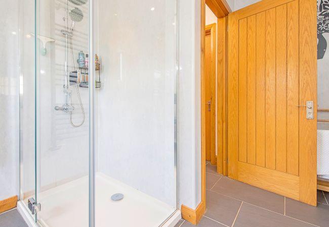 Inside, the property is thoughtfully finished with solid oak furnishings and cosy underfloor heating throughout. The light-filled sitting area features a welcoming woodburning stove, creating the perfect space to unwind after a day exploring. An open archway leads through to the stylish, well-equipped kitchen and dining area, ideal for cooking and enjoying meals together.