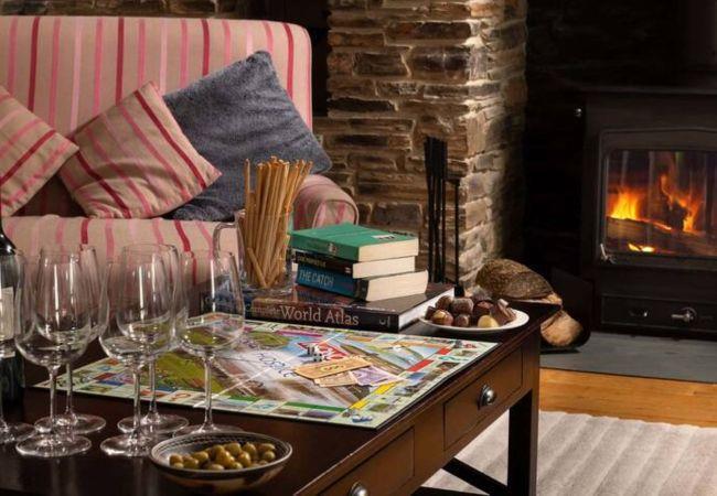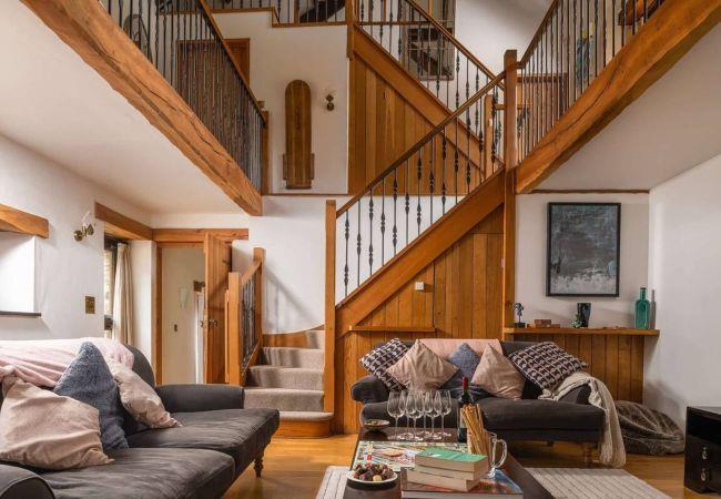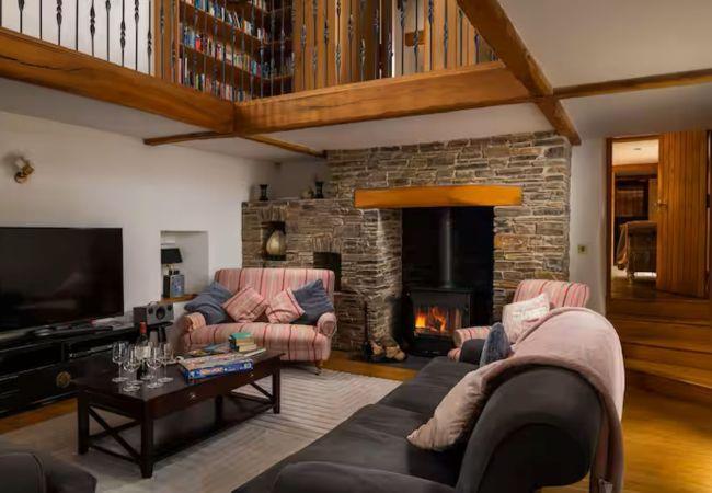 Inside, triple-height vaulted ceilings, exposed stone walls, and warm wood finishes create an inviting atmosphere. The fully equipped kitchen, with its four-door electric Aga and espresso machine, makes group dining a pleasure, while the mezzanine snug offers a cosy hideaway with a well-stocked library and sweeping valley views.