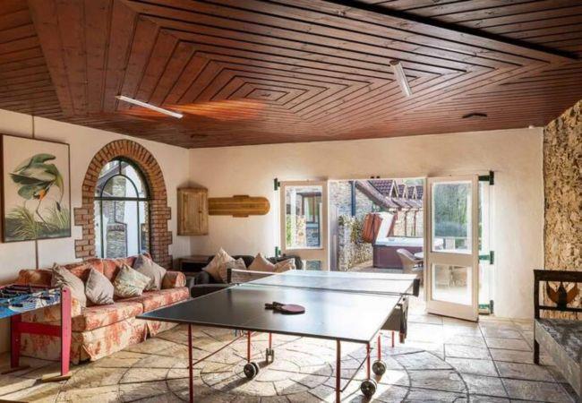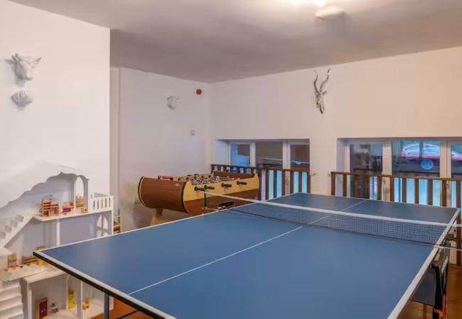 The ground-floor hallway leads to a handy downstairs toilet and a snug area with a 50-inch smart TV, flowing into a fully equipped kitchen featuring a range cooker and farmhouse table. The kitchen opens onto the garden room, where you’ll find table tennis and table football. This area extends out to a private south-facing terrace with a hot tub, barbecue, sun loungers, and an outdoor rattan dining set.