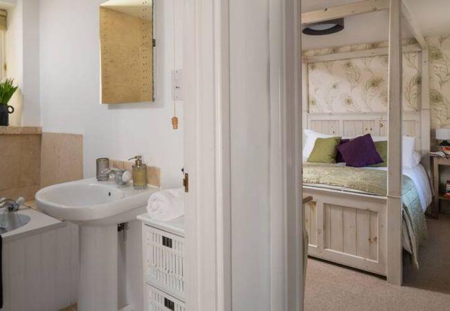 A small winding staircase takes you to the first-floor landing, where you’ll find two comfortable bedrooms: one with a king-size four-poster bed and the other with twin beds. The bathroom includes a bath, shower, toilet, and wash basin.