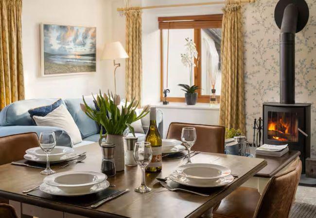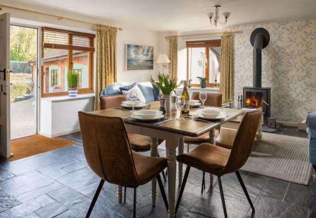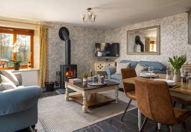 Downstairs, the spacious open-plan living area brings together a well-equipped kitchen, a dining space, and a comfortable lounge with a log-burning stove and Smart TV. The kitchen features modern appliances, including a dishwasher, making meal preparation easy and enjoyable. From the main window, you can take in a stunning view across your private terrace and down the scenic valley.