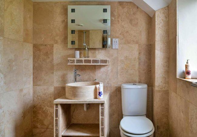 Upstairs, the bedroom is furnished with a king-size wrought iron bed and decorated with elegant Nina Campbell wallpaper. Off the bedroom is a small cot room* with a wooden cot—perfect for parents travelling with a baby or toddler. The separate marble-lined wet room features a striking solid marble basin.