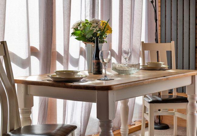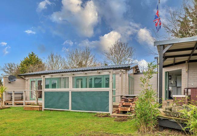 The open-plan kitchen and living room is large and well-proportioned. The wood-panelled walls give the lodge a warm and cosy feel whilst the grand fireplace under the smart TV will guarantee guests are kept snug even on the coldest nights. The kitchen comes well-stocked with all the amenities guests would need to cook up a feast and there is also a handy utility room next door housing a washing machine and dryer.