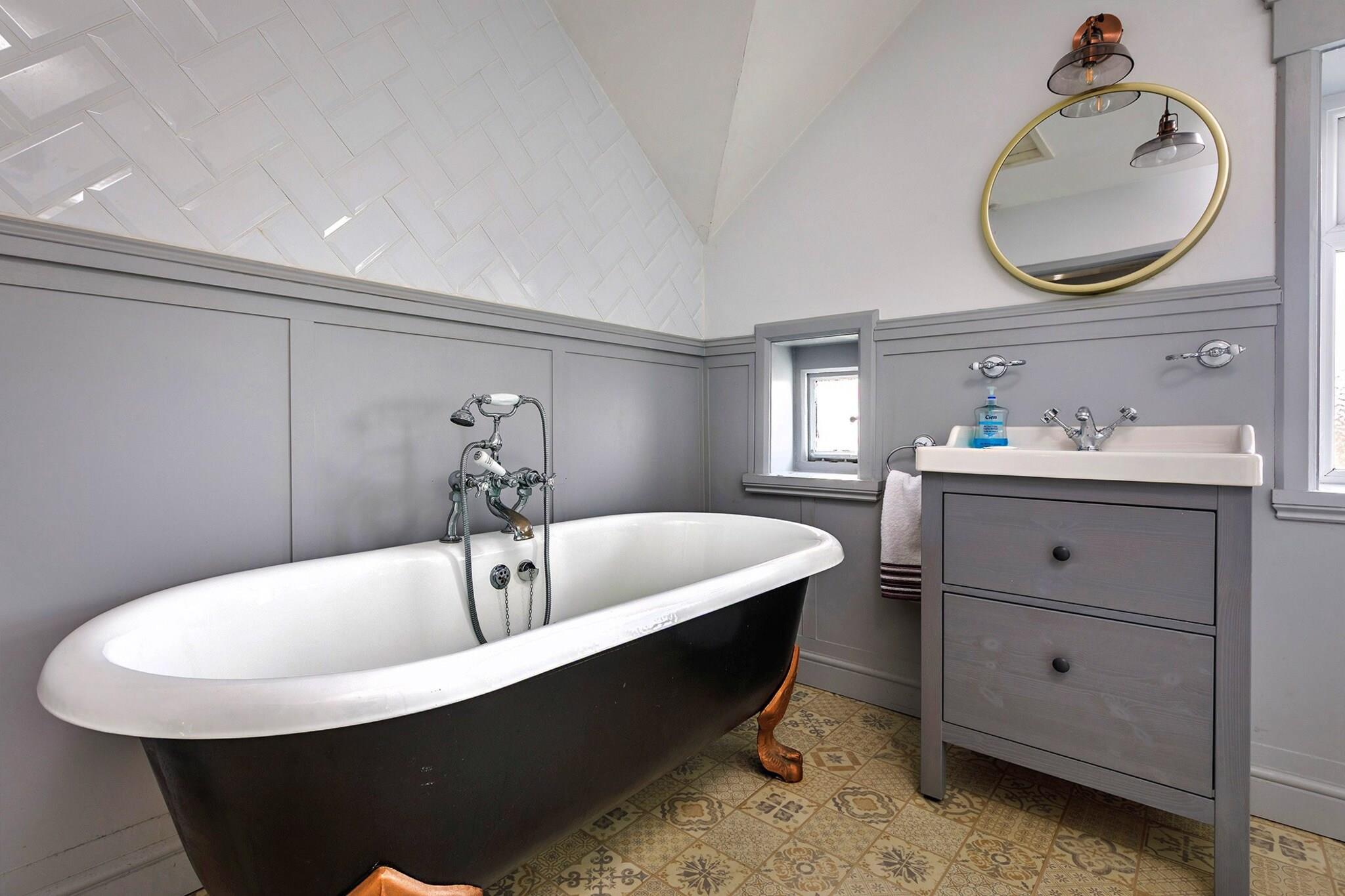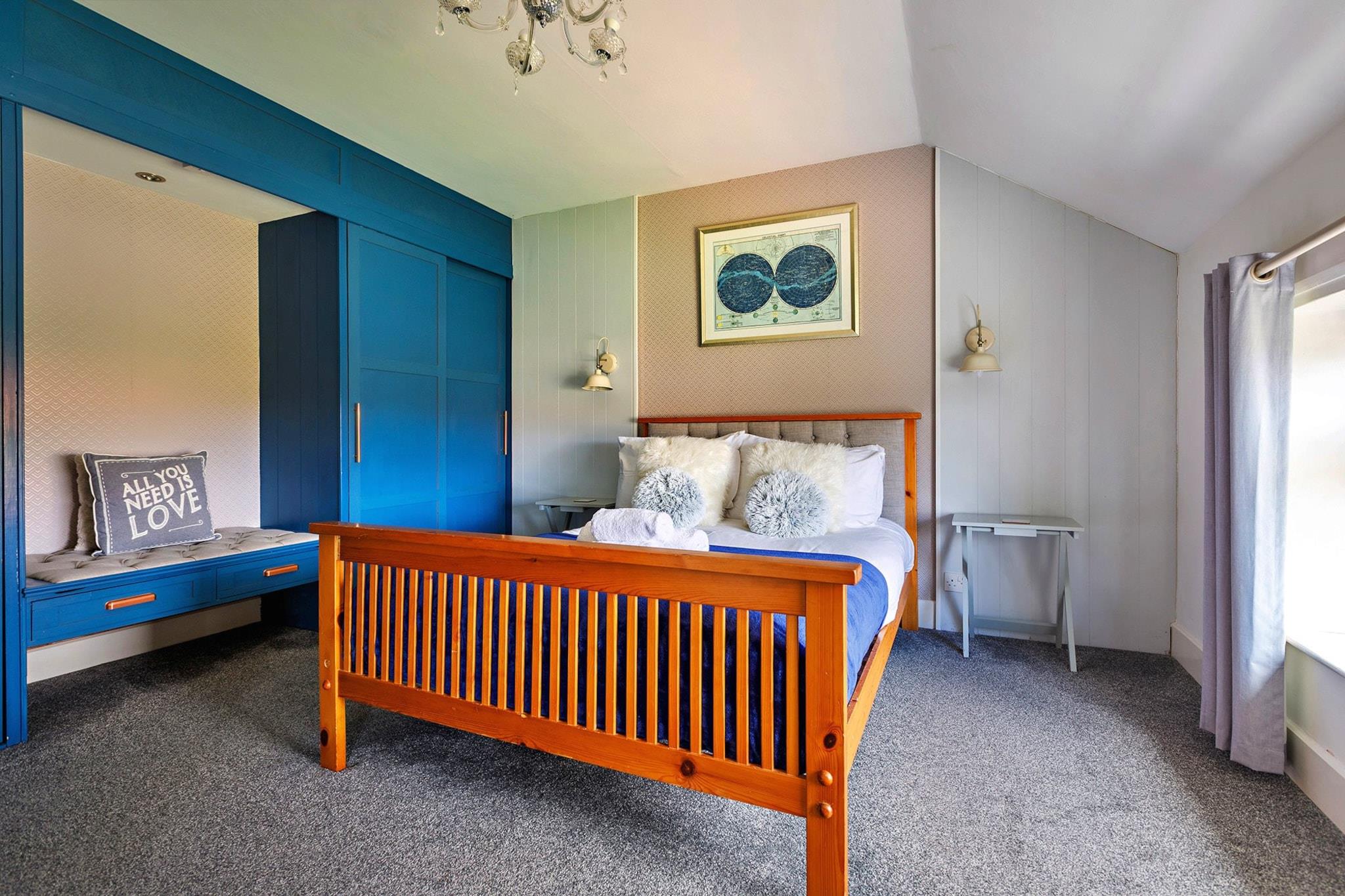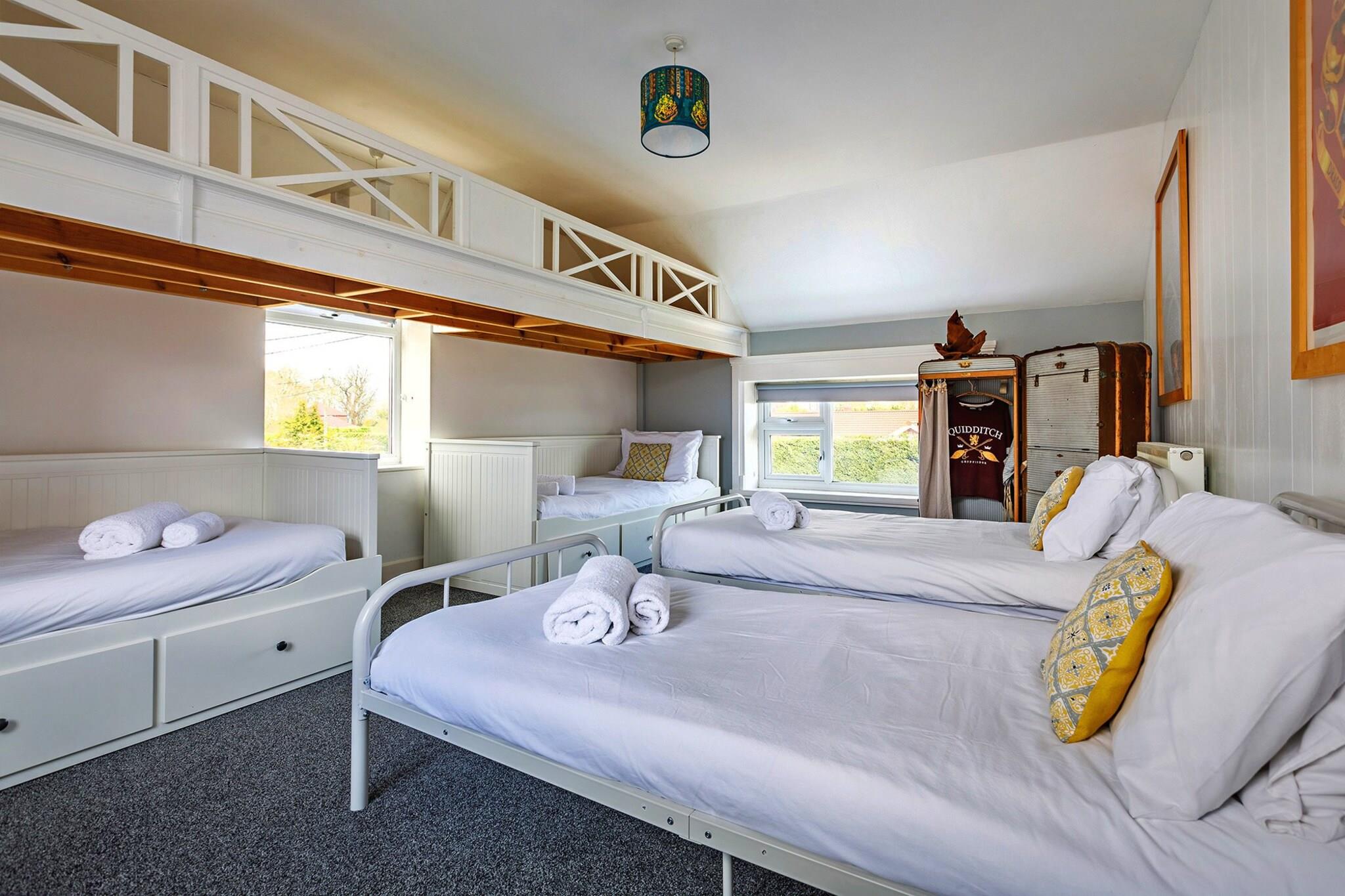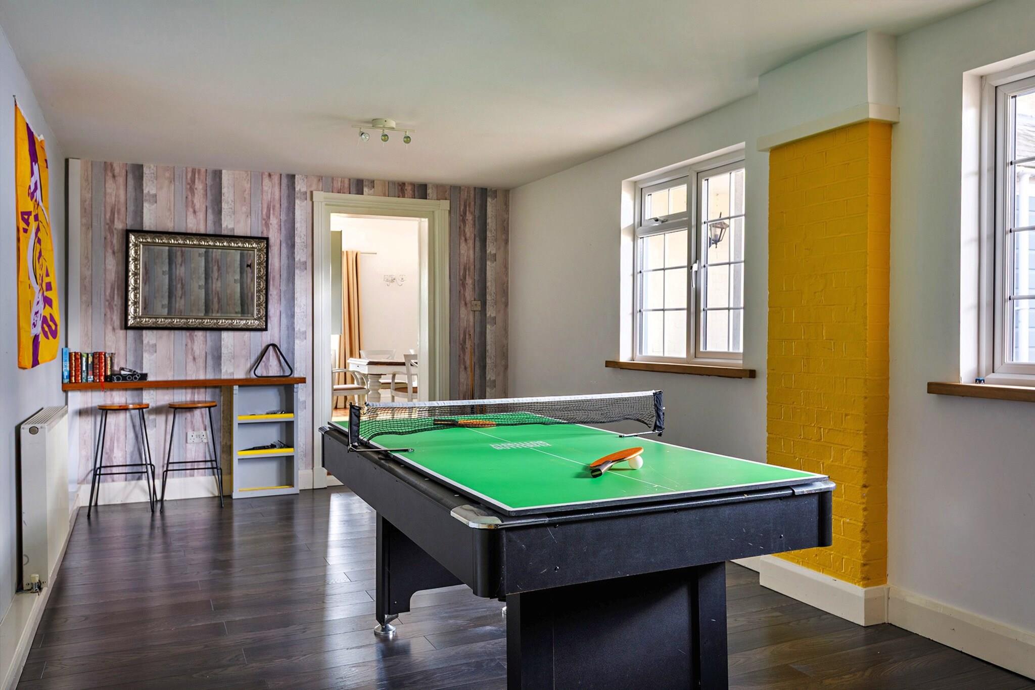 This charming cottage, nestled in the village of Crimplesham, offers a luxurious and spacious retreat for families and groups. The property can comfortably accommodate up to 7 adults and 4 children in its five beautifully appointed bedrooms. The cottage features a large, fully equipped kitchen and a dining room perfect for family meals. Guests can enjoy a unique games room with a pool table, table tennis, and a game console. The property also includes a cozy living room with a fireplace for a relaxing evening in. The South-facing, enclosed garden provides the ideal space for outdoor dining and BBQs, making it perfect for warm summer evenings. The house is pet-free, ensuring a peaceful atmosphere for all guests. Located just a short distance from Downham Market, guests can explore this historic market town, known for its fine buildings, craft markets, and the iconic black-and-white clock in the town square. For more cultural experiences, the nearby town of Ely boasts a stunning cathedral, picturesque architecture, and riverside dining options. For outdoor lovers, The Stables provides access to the Fen Rivers Way footpath, golf courses, and various angling sites. Additionally, the stunning beaches of North Norfolk, including Hunstanton and Cromer, are just a short drive away. Inside, the cottage offers a well-equipped kitchen with modern amenities, including a washing machine for added convenience. The luxurious family bathroom features a roll-top bath, a spacious walk-in shower, and traditional furniture. The bedrooms are designed with comfort in mind, with the master bedroom offering built-in wardrobes and a double bed.