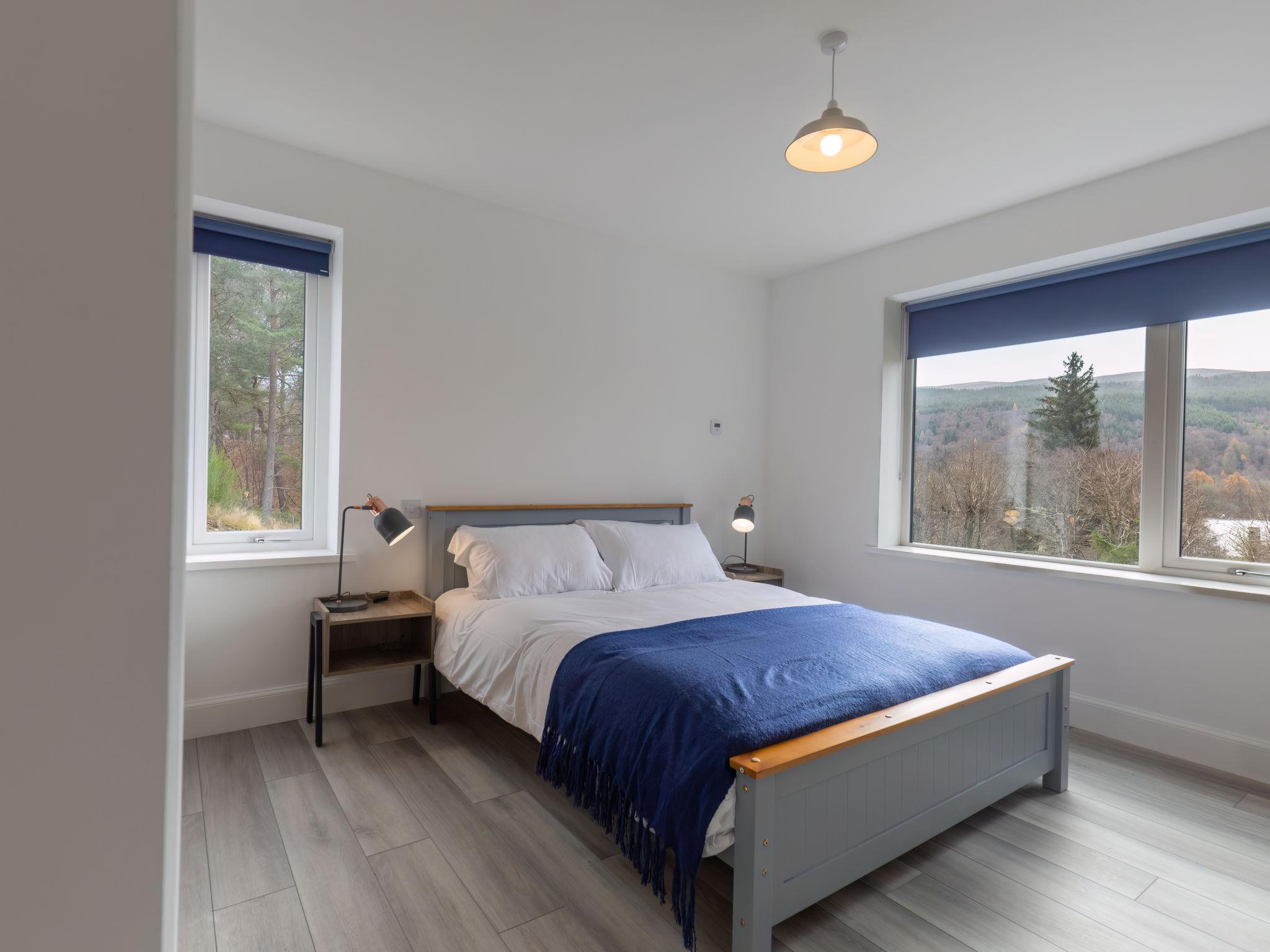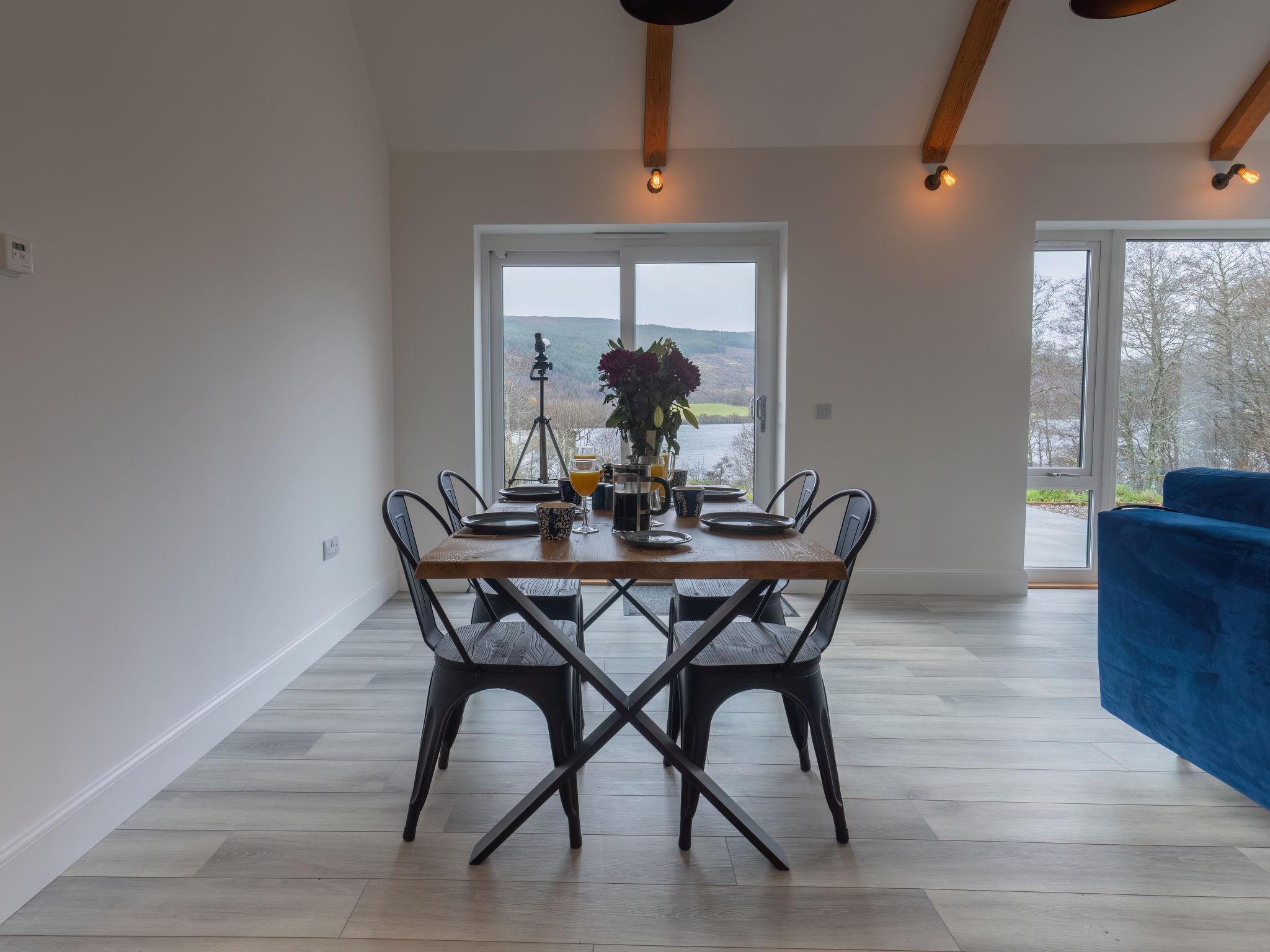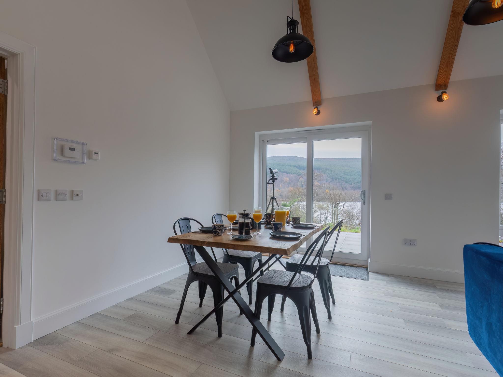 3-room chalet 92 m2. Spacious and bright, tasteful and stylish furnishings: open large living room with Scandinavian wood stove, dining table and TV (flat screen). Exit to the patio. 1 double bedroom with 1 double bed and shower/WC. 1 room with 2 beds. Open kitchen (4 hot plates, oven, dishwasher, microwave, freezer, grill). Shower/WC. Underfloor heating. Terrace furniture, barbecue. Marvellous panoramic view of the lake and the countryside. Facilities: washing machine, iron, children's high chair, baby cot for up to 2 year olds (extra), hair dryer. Internet (WiFi, free). Please note: suitable for families. Maximum 2 pets/ dogs allowed. TV only EN. Smoke alarm. The property sits in a beautiful peaceful location in nature overlooking Loch Meiklie. Telescope for stargazers.