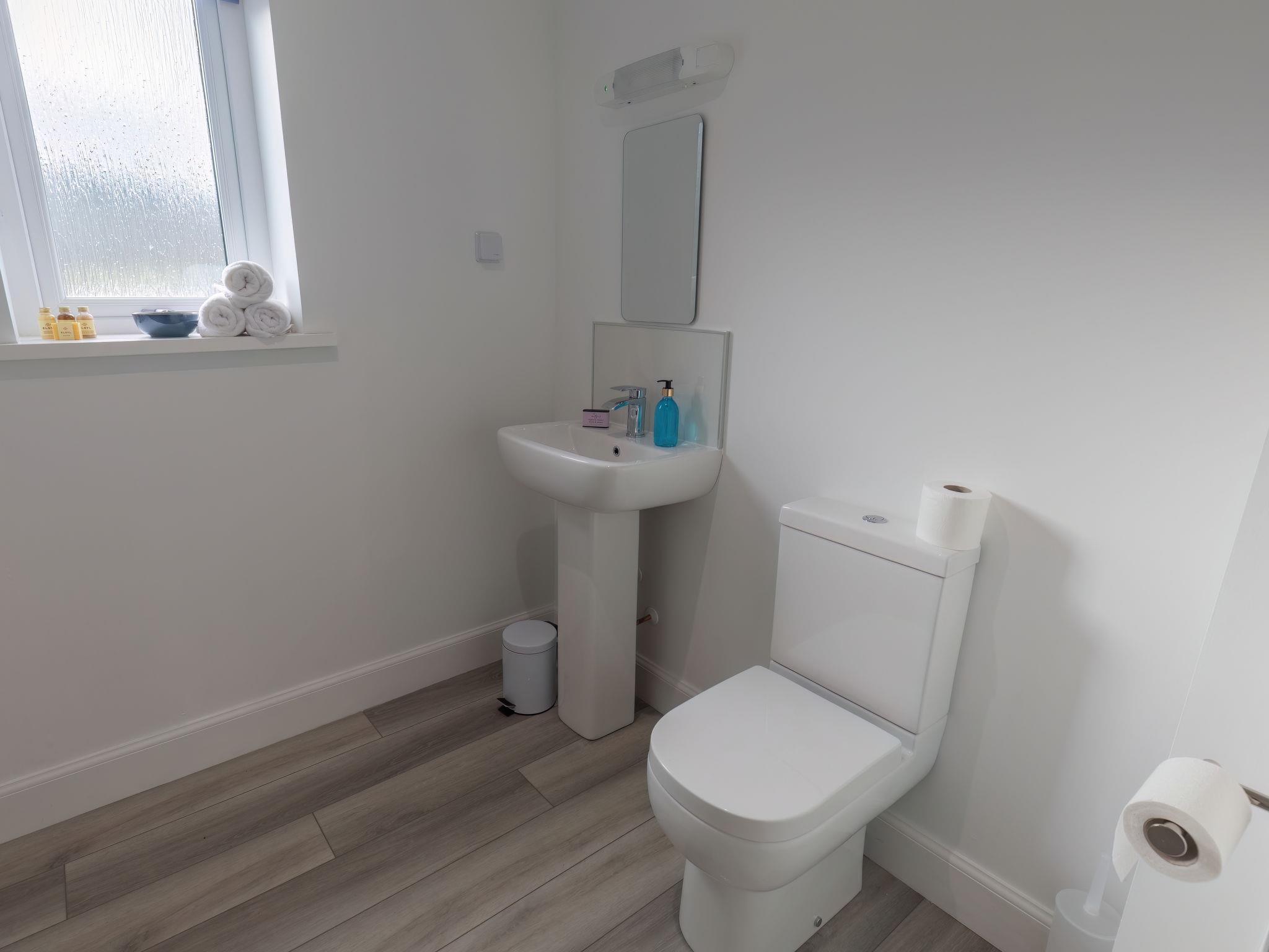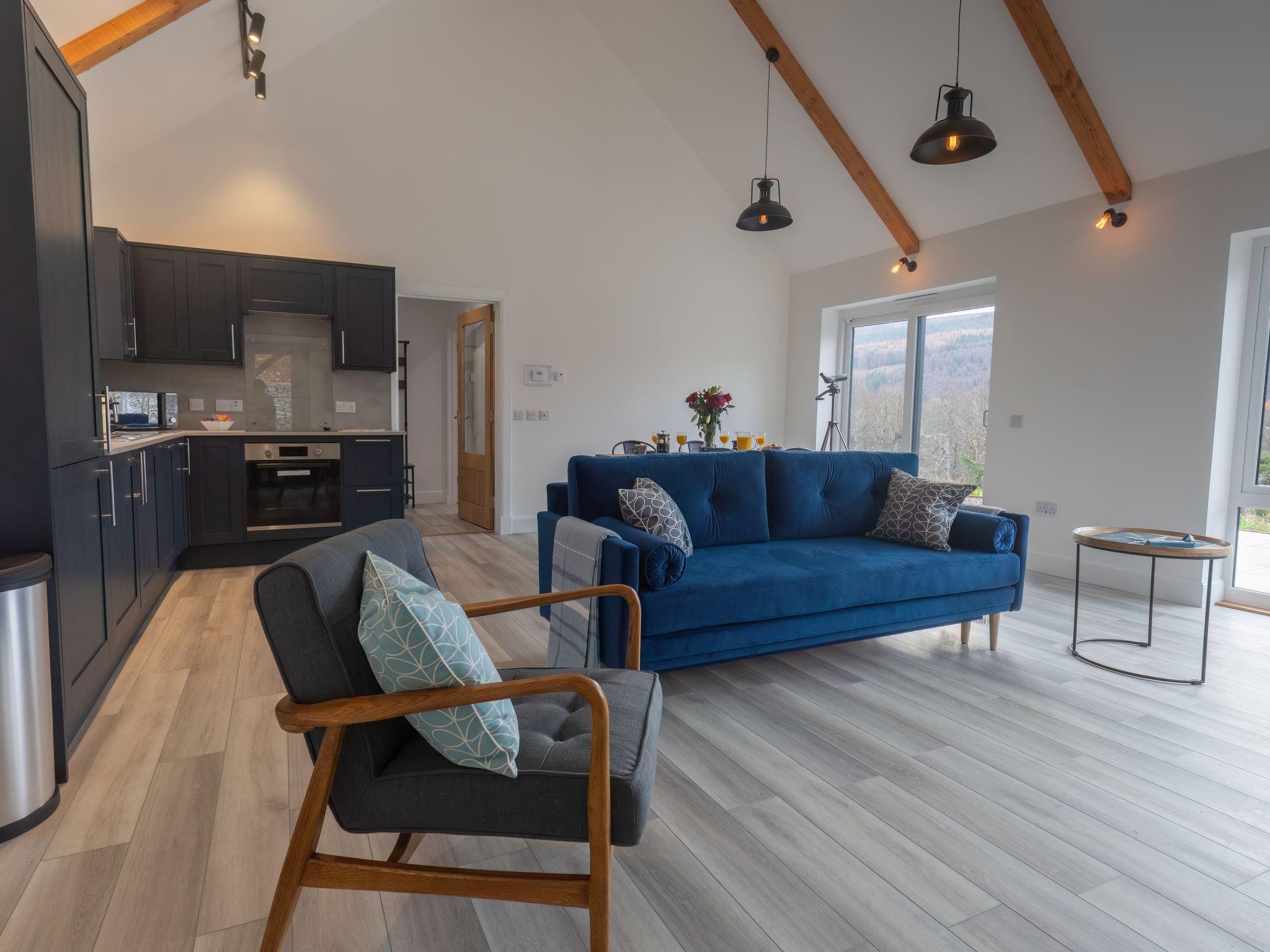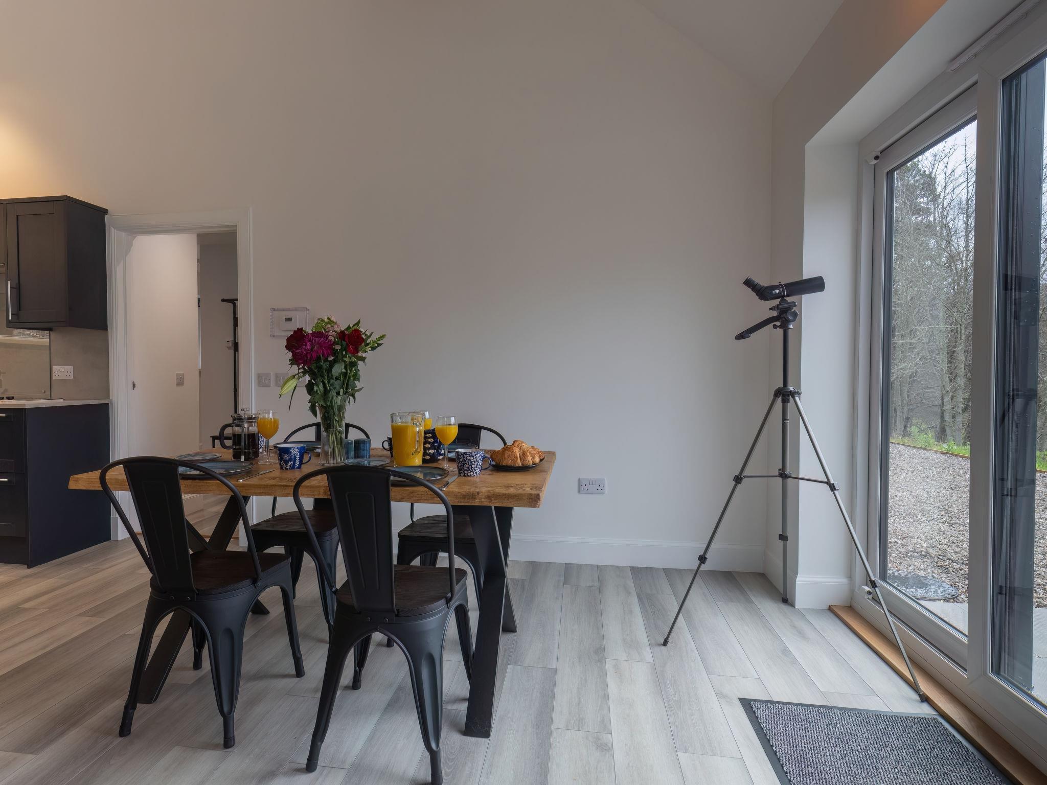 3-room chalet 92 m2. Spacious and bright, tasteful and stylish furnishings: open large living room with Scandinavian wood stove, dining table and TV (flat screen). Exit to the patio. 1 double bedroom with 1 double bed and shower/WC. 1 room with 2 beds. Open kitchen (4 hot plates, oven, dishwasher, microwave, freezer, grill). Shower/WC. Underfloor heating. Terrace furniture, barbecue. Marvellous panoramic view of the lake and the countryside. Facilities: washing machine, iron, children's high chair, baby cot for up to 2 year olds (extra), hair dryer. Internet (WiFi, free). Please note: suitable for families. Maximum 2 pets/ dogs allowed. TV only EN. Smoke alarm. The property sits in a beautiful peaceful location in nature overlooking Loch Meiklie. Telescope for stargazers.
