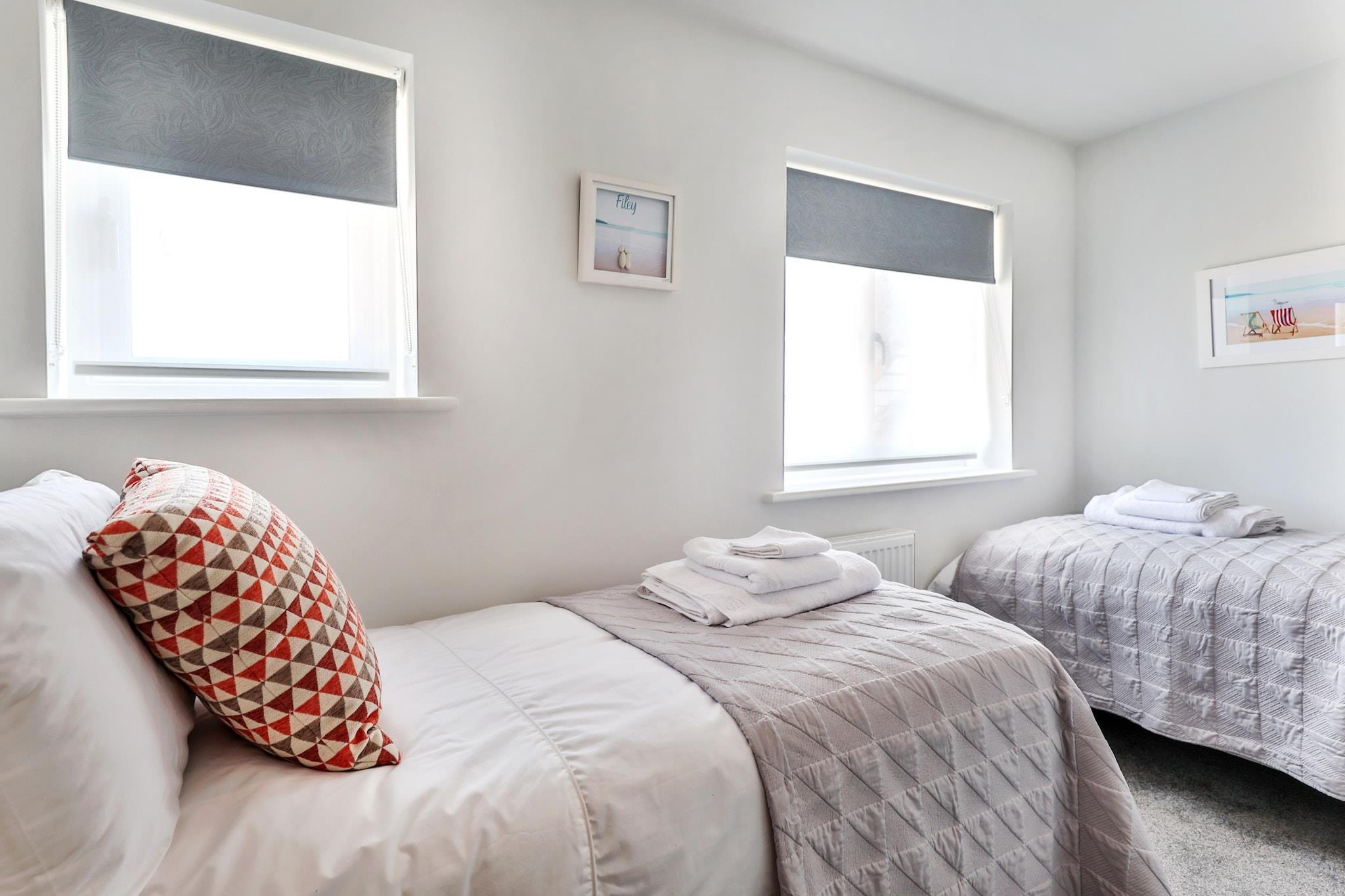 Situated in the heart of Filey, just a short stroll from the beach, this newly refurbished first-floor apartment is the perfect base for your seaside getaway. Whether you're exploring local shops, cafés, or enjoying the tranquil coastline, this pet-friendly apartment offers everything you need for a comfortable stay. The open-plan living area is bright and spacious, featuring comfy sofas, a wall-mounted flat-screen TV, and a selection of board games for family fun after a day at the beach. The well-equipped kitchen includes all modern amenities, such as a Nespresso machine, dishwasher, microwave, oven, and more to ensure that you feel at home. The master bedroom boasts a king-size bed, ample storage, and an en-suite shower room, while the second bedroom offers two single beds, perfect for children or friends. The main family bathroom includes a luxurious bath with a shower over, heated towel rail, and a back-lit mirror to enhance your stay. Step outside to explore the coastal charm of Filey, where the beach is just 0.5 km away. Glen Gardens, adventure golf, and the Flamborough Headland Heritage Coast are all nearby, perfect for outdoor enthusiasts. Plus, Scarborough is only a 20-minute drive away for even more attractions. This apartment is ideal for families, couples, or small groups looking for a relaxing escape with the convenience of being close to the beach and local attractions, with free allocated parking and pet-friendly accommodations.