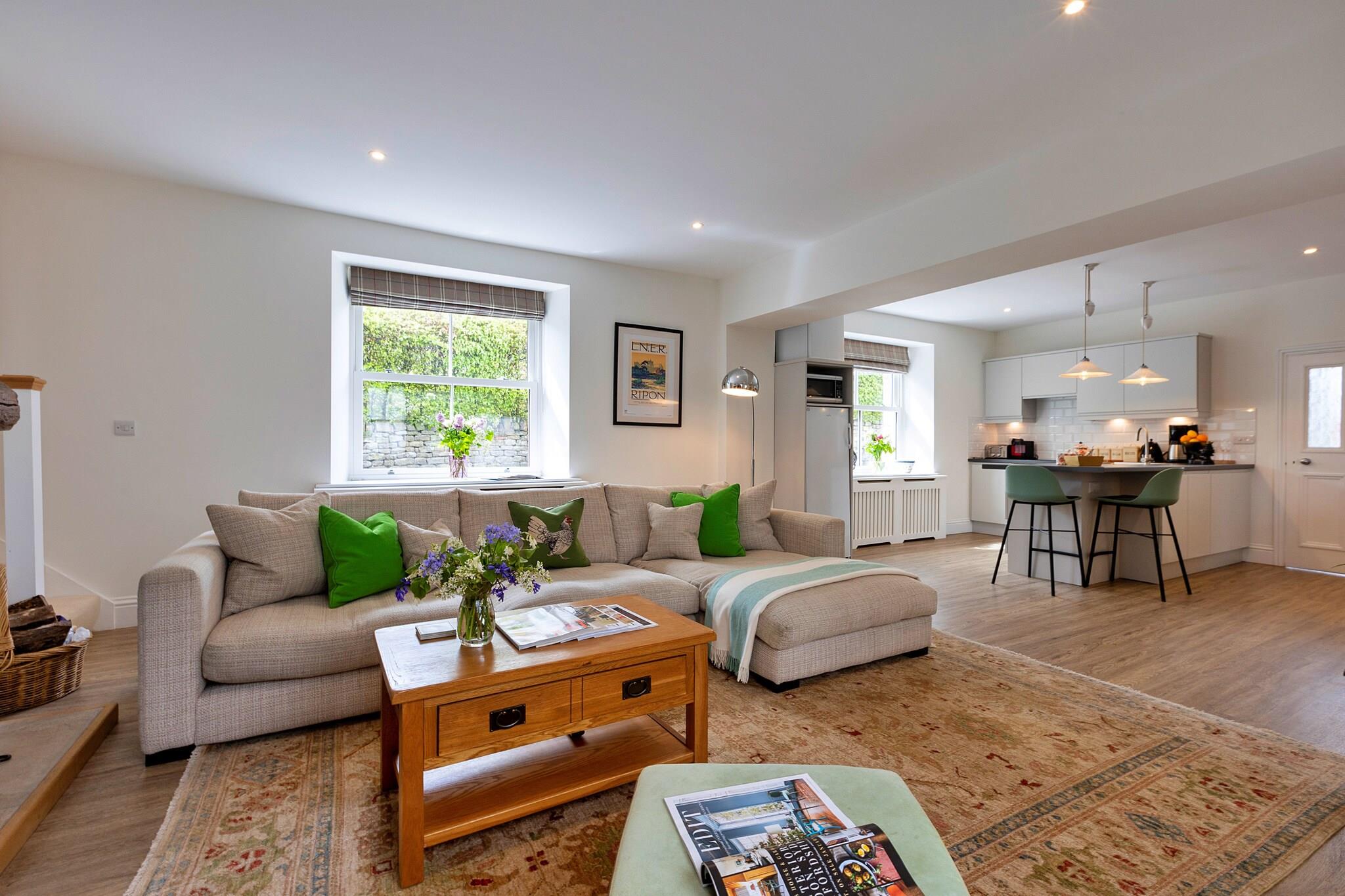 Welcome to a stylish and inviting holiday cottage located in the picturesque village of Grantley, just a short drive from Ripon, Grantley Hall, and Fountains Abbey. This property is perfect for anyone seeking a comfortable and luxurious escape, whether attending an event at Grantley Hall or simply looking to enjoy the beauty of the Yorkshire countryside. The ground floor features a spacious, open-plan living area designed for relaxation and practicality. The well-equipped kitchen includes modern appliances, such as an electric oven, hob, microwave, fridge, and dishwasher, along with a coffee machine to kickstart your mornings. A large corner sofa in the living room invites you to unwind, accompanied by a Smart TV and a wood burner for cozy evenings. The ground floor also boasts a shower room with a walk-in shower, heated towel rail, and underfloor heating to keep your toes warm. Additionally, a heated utility room provides space to dry damp coats and cater to your furry friends. On the first floor, you'll find a spacious bedroom featuring a luxurious super king-size zip-and-link bed. From here, you can step out onto a balcony, offering a peaceful spot with seating to appreciate scenic countryside views. Equipped with modern comforts like Wi-Fi and a welcome pack upon arrival, parking is available for one vehicle. Situated in the heart of the Nidderdale Area of Outstanding Natural Beauty, this retreat is close to stunning landscapes, local pubs, and historical sites, including the oldest cathedral in England. Fountains Abbey and the elegant spa town of Harrogate are also within easy reach, providing perfect options for relaxation and exploration. For larger groups, the option to book an adjacent property is available, accommodating up to six guests in total.