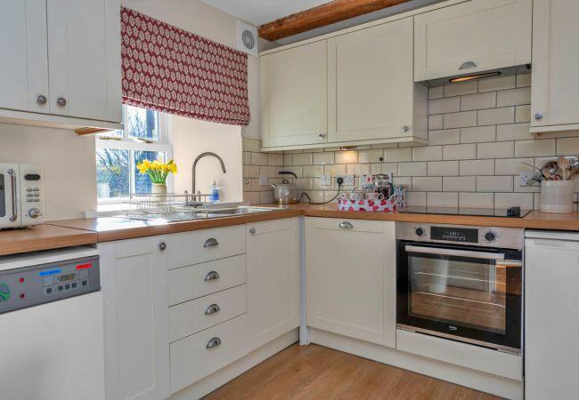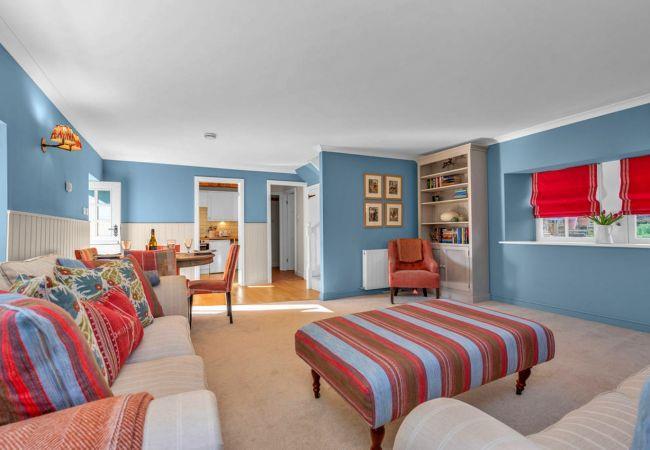 Inside, the sitting room exudes effortless style and warmth. Flooded with natural light from windows on every side overlooking the pretty cottage garden and mill stream below, the space combines plush carpeting, cosy sofas, promising a truly relaxing holiday stay.