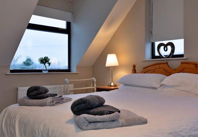The property accommodates up to six guests across three bedrooms. The spacious master bedroom features a double bed with an en-suite shower room, offering stunning views of the surrounding landscape. The second bedroom is a comfortable double with a wardrobe, while the third bedroom has bunk beds, ideal for younger guests. These two rooms share a well-appointed family bathroom with a bath, separate shower, basin, and WC.