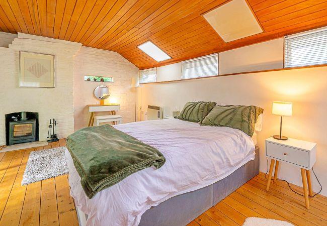 The bright and airy bedroom features two comfortable beds and a warm wooden interior, with charming touches like an easel and telescope, making it a great spot for creatives or stargazers. A cosy wood-burning stove and ample natural light add to the serene ambiance.
