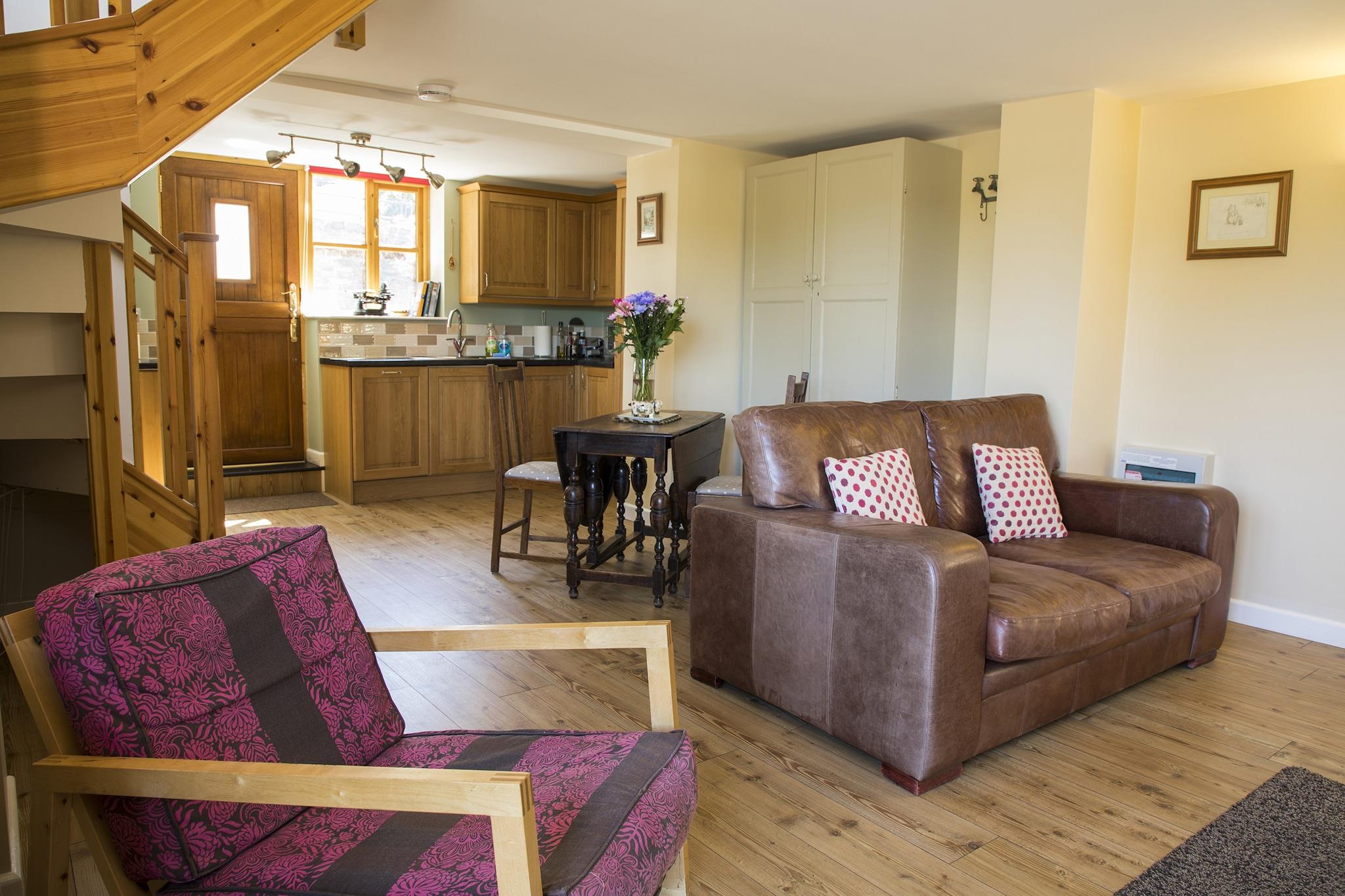 This charming and luxurious one-bedroom cottage is perfect for couples or solo travelers seeking a peaceful country retreat. Located in a converted 19th-century barn, the property features a spacious open-plan living and dining area with comfortable seating, an oak fireplace, and underfloor heating. The kitchen is fully equipped with an oven, hob, dishwasher, microwave, toaster, fridge-freezer, and washing machine, making it ideal for self-catering. The cottage accommodates one well-behaved dog and includes a small cot for an infant upon request. A private parking area is also provided for added convenience. The cottage is nestled in a tranquil rural location near Llangollen, offering stunning views of Castell Dinas Bran and the surrounding Dee Valley. This picturesque setting allows guests to enjoy both the serenity of the countryside and easy access to Llangollen’s vibrant tourist amenities. The area is renowned for its scenic walking trails, and local maps and guides are provided to help guests explore the stunning landscape. The nearest public footpaths and lanes offer ample opportunity for outdoor exploration, with nearby towns and attractions also easily accessible. The upstairs bedroom features a king-sized bed and exposed oak beams, offering breathtaking views of the valley and mountains. The en-suite bathroom includes a double-ended roll-top bath and an over-bath shower for a relaxing retreat. The enclosed courtyard outside features garden furniture, providing a peaceful space to enjoy the surroundings. Bed linens, towels, and a complimentary welcome pack with locally sourced luxuries are provided for guests’ comfort.