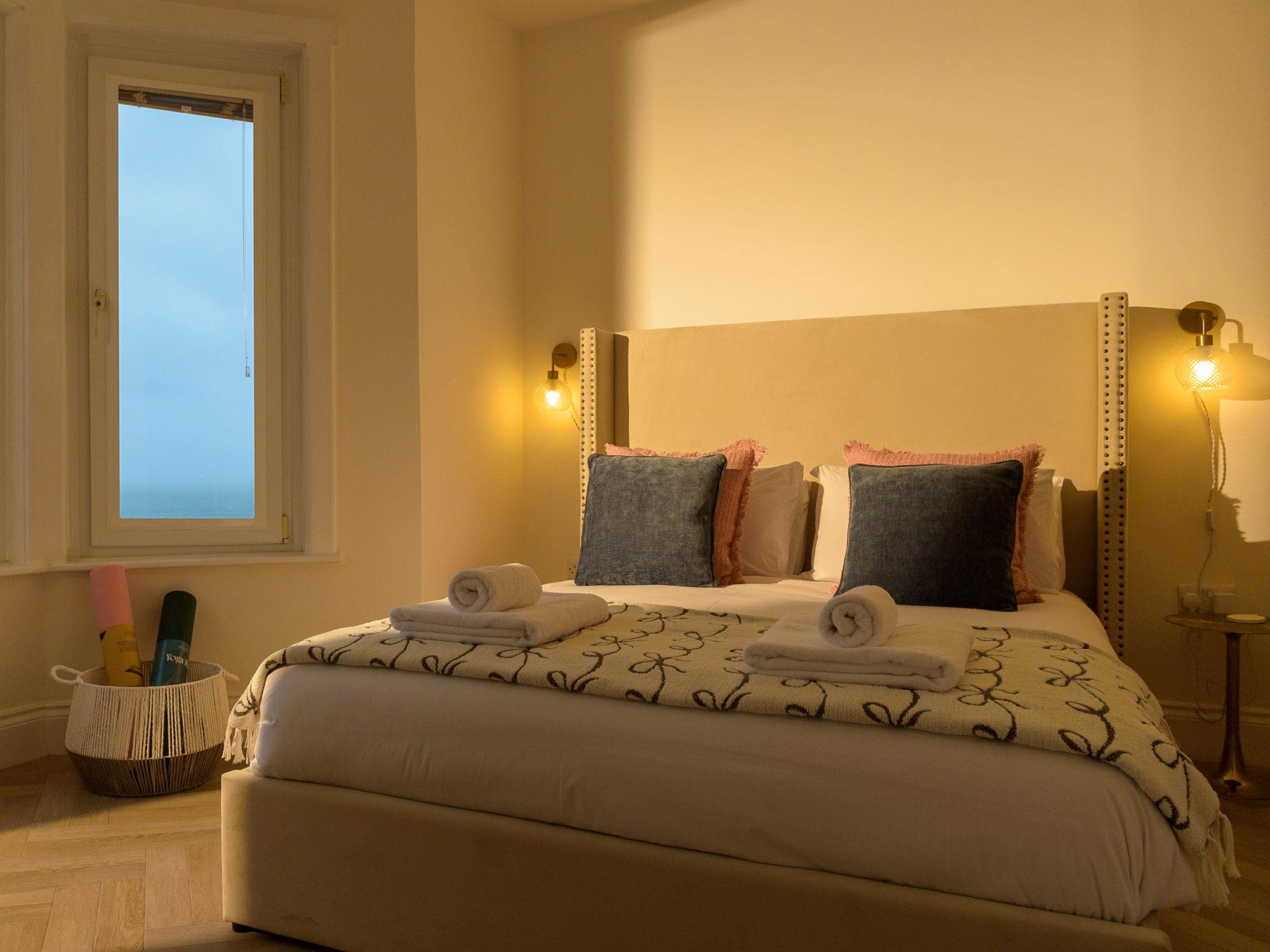"No.4 Ocean Heights", 3-room apartment. Spacious and bright, modern and luxurious furnishings: open living room with panoramic window with TV (flat screen). Exit to the balcony. 1 double bedroom with 1 double bed and shower/WC. 1 double bedroom with 1 double bed. Open kitchen (2 hot plates, dishwasher, toaster, kettle, freezer, electric coffee machine) with dining table. Shower/WC. Electric heating. Small balcony. Balcony furniture. Marvellous panoramic view of the sea and the town. Facilities: washing machine. Internet (WiFi, free). Parking space n 4. Please note: TV only EN. Smoke alarm, no lift. Kitchen with no oven, 2 X hot plates, microwave and air fryer.