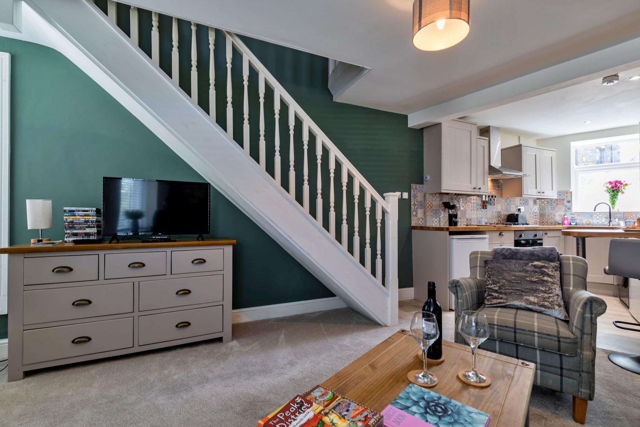 Introducing this recently renovated one-bedroom cottage in New Mills, an attractive stone building lovingly refurbished to a high standard. It serves as an ideal base for exploring the breathtaking Peak District National Park and scenic canal walks, perfect for those who enjoy both hiking and leisurely strolls through local natural beauty spots. As you enter, you’re welcomed by an open-plan lounge and kitchen. Stylish sofas are set before a charming, exposed stone wall, creating a cozy atmosphere. The well-equipped kitchen features modern appliances, including an oven, hob, microwave, fridge/freezer, kettle, and toaster, as well as a solid wooden breakfast bar, perfect for enjoying your morning coffee. A staircase leads from the lounge to a spacious double en-suite bedroom, where you’ll find a lavish bathroom complete with a walk-in shower and heated towel rail. The property includes central heating, Wi-Fi, and a flat-screen television with a DVD player for your comfort and entertainment. After a restful night, explore nearby New Mills Marina or enjoy the town’s vibrant atmosphere, which boasts independent shops, cafes, art galleries, pubs, and award-winning eateries. This charming cottage, dating back to the 1850s, is a super location for your holiday getaway. A four-legged friend is welcome for a small fee, but please note there is no garden, and the property is not suitable for young children.