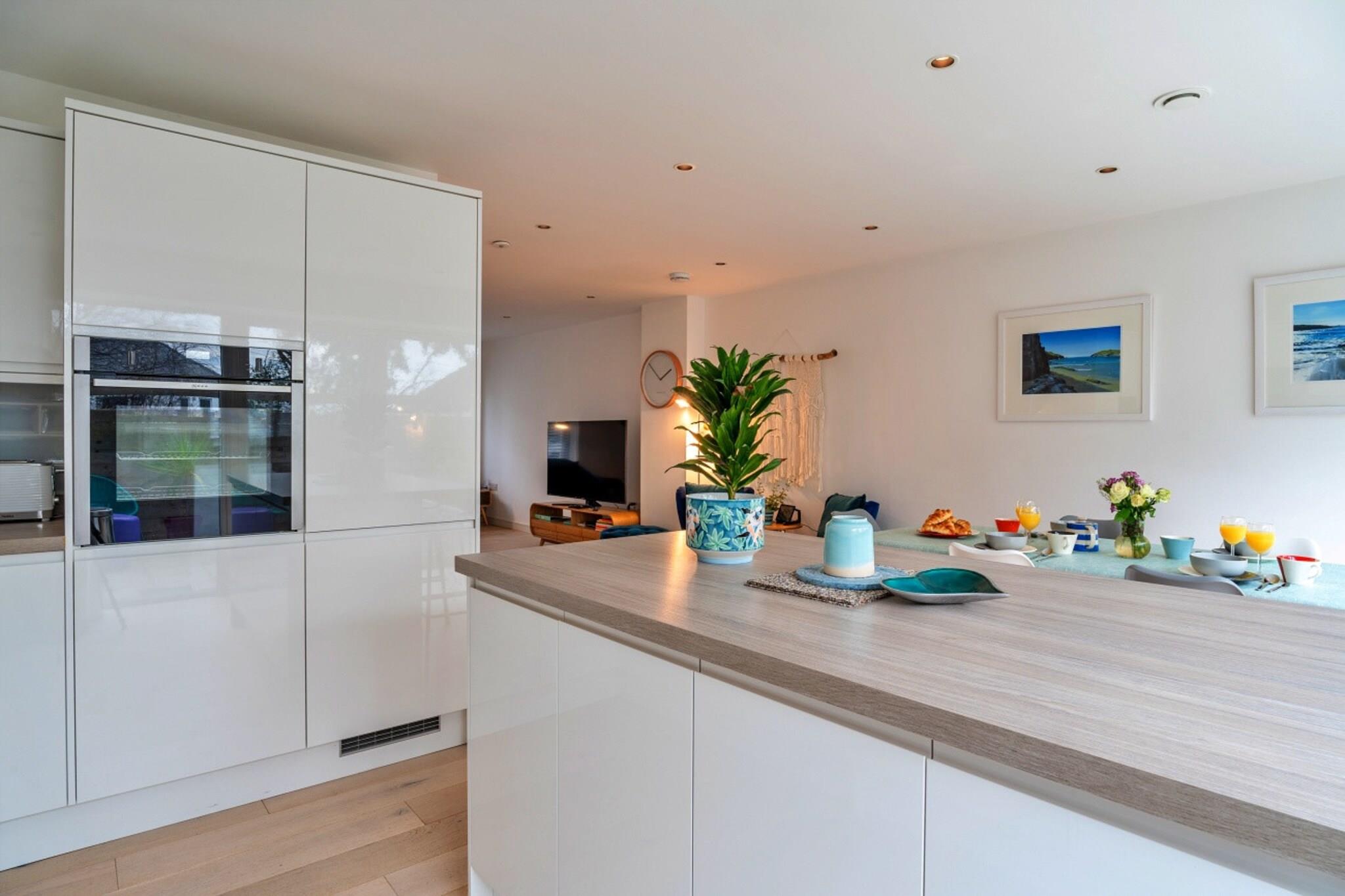 This beautifully presented townhouse, located in the beachside town of Newquay, offers a modern and spacious retreat perfect for families, friends, or couples. The open-plan living and dining area is the heart of the home, featuring a fully equipped kitchen with a breakfast bar, integrated appliances, and a dining table that accommodates all guests. Large patio doors lead to a private garden with modern garden furniture and a BBQ, making it the ideal spot for outdoor dining and relaxation. The townhouse also includes a cloakroom W/C off the entrance, ensuring added convenience. Newquay is a vibrant seaside town offering a wide range of amenities and attractions. The property is just a 5-minute walk from Towan Beach and Fistral Beach, two of the town's most popular beaches, perfect for beachgoers and surfers alike. Explore nearby coastal walks, including picturesque trails to Crantock, or venture to popular beaches like Watergate Bay within a 4-mile radius. The town also offers a cinema, aquarium, golf course, and a variety of shops and restaurants, ensuring entertainment for all ages. On the first floor, there is a king-sized bedroom with an en-suite shower room, a twin bedroom that can be converted into a double, and a family bathroom with a shower and bathtub. The top floor features another king-sized bedroom with a sofa bed and an en-suite shower room. The townhouse also includes amenities like internet access, parking, a washing machine, and baby facilities, ensuring a comfortable and convenient stay.