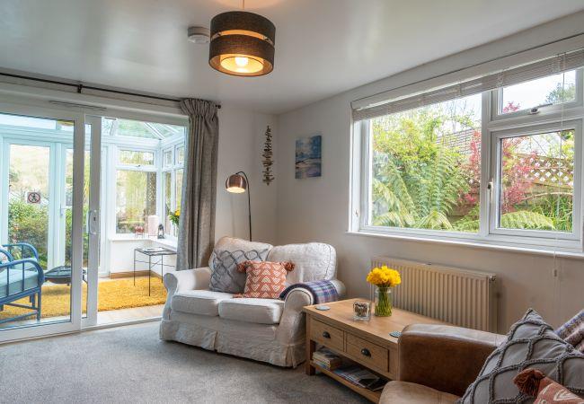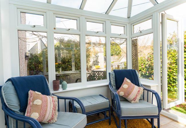 The living room is spacious and light with two sofas, smart TV with freesat and streaming platforms, and double patio doors leading out to the conservatory. This sunny room overlooks the garden and makes a great space for morning coffees, afternoon naps, or poring over the OS map to find your way to that hidden beach.
