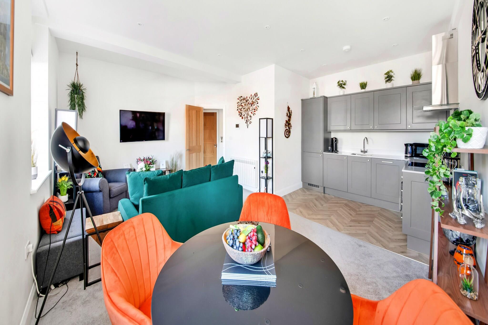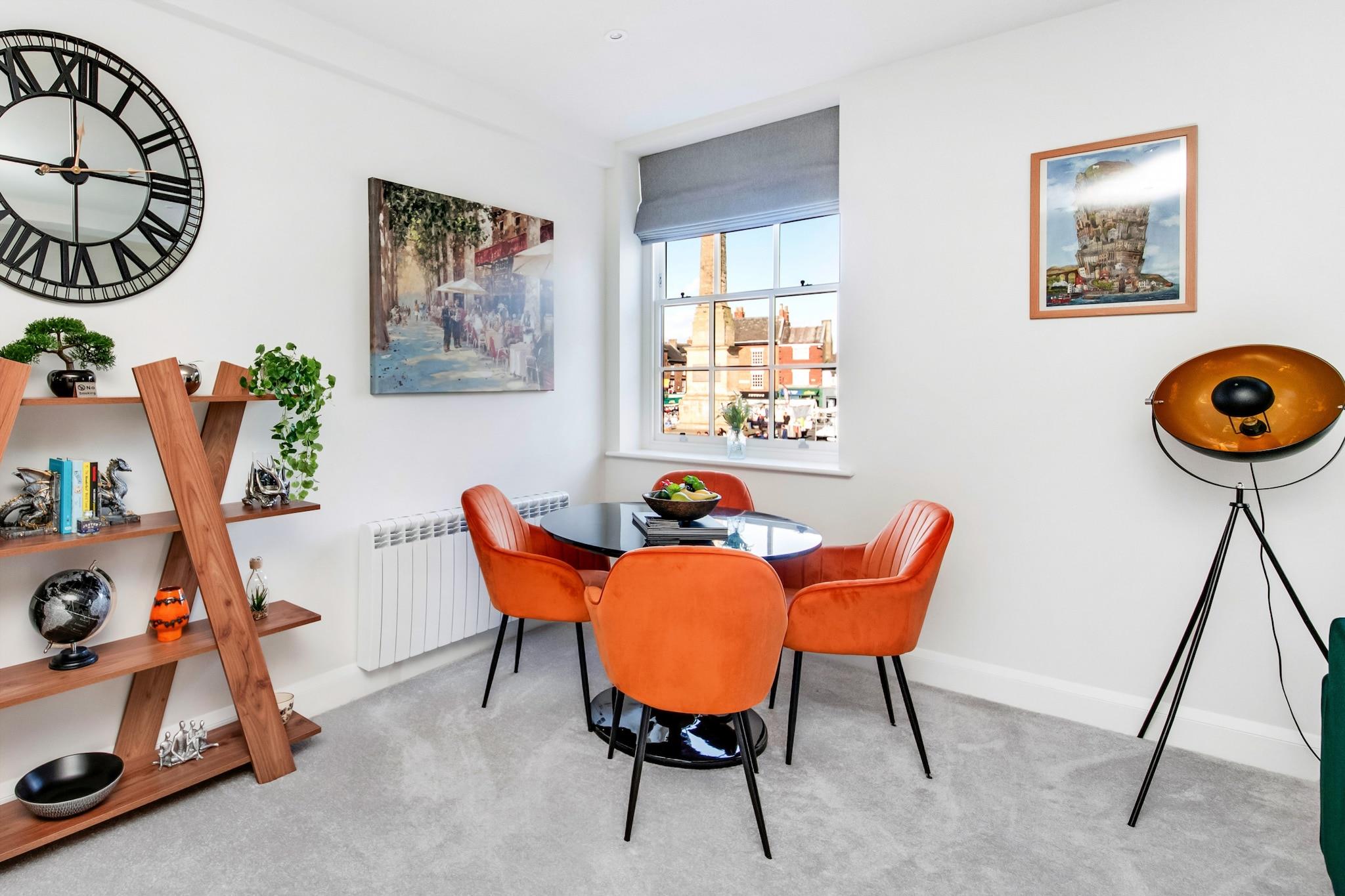 Nestled in the heart of Ripon's Market Place, this charming one-bedroom apartment seamlessly blends modern comfort with elegant style, making it an ideal getaway. Step into the inviting living room, adorned with tasteful decor, where a comfortable sofa and armchair beckon you to relax in front of the wall-mounted smart TV. The warm and welcoming atmosphere is perfect for unwinding after a day of exploring. The living area seamlessly connects to a fully equipped kitchen and dining space, offering everything you need for a delightful stay. With amenities like a dishwasher, oven, hobs, fridge-freezer, kettle, microwave, and coffee machine at your fingertips, you can brew fresh coffee each morning and prepare your own meals with ease. If you prefer dining out, a delightful array of cafes and restaurants in Ripon is sure to satisfy your culinary cravings. Retreat to the cozy bedroom, featuring a plush king-size bed and a flat-screen TV, providing a chic space to relax. Ample storage, including hangers and bedside drawers, ensures you can settle in comfortably. The modern bathroom boasts a stylish design with a bathtub, overhead shower, wash basin, and WC, creating a bright and refreshing ambiance. This wonderful apartment is not only a comfortable sanctuary but also serves as a fantastic base for your adventures in the area. Please note, however, that due to the number of steps from the car park and entrance, it may not be suitable for those with mobility difficulties. Whether you’re planning a romantic escape or a solo adventure, this delightful retreat is ready to welcome you.