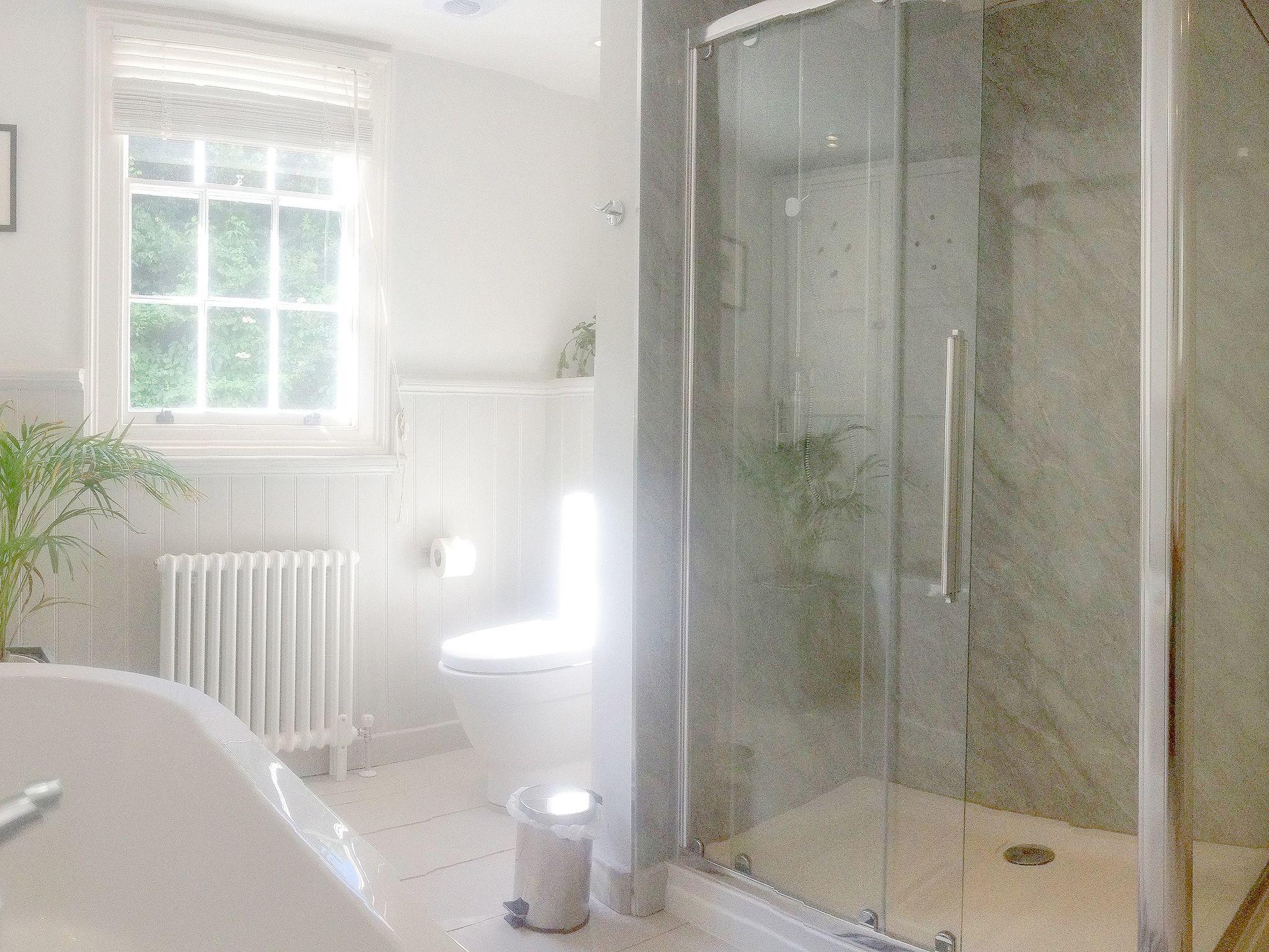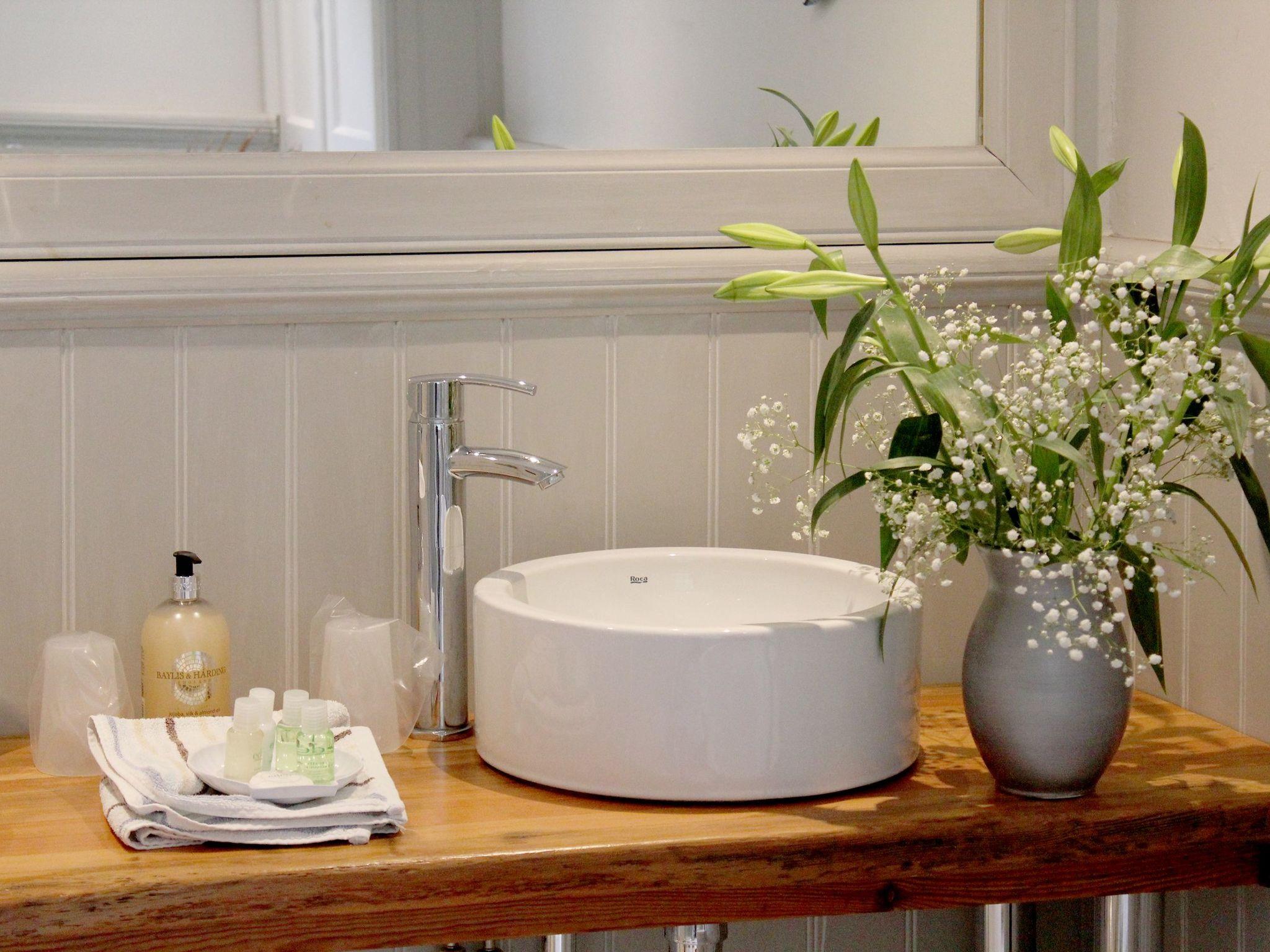 The master bathroom is a work of art. Two lovely round ceramic handbasins perched on a large chunk of recycled ship's timbers in front of the largest mirror. The freestanding bath is the centrepiece made for luxuriating in steamy splendour. Across the vast space is the shower enclosure with fixed monsoon shower and hand held shower as well. And tucked discreetly around the corner is the loo with soft close lids.