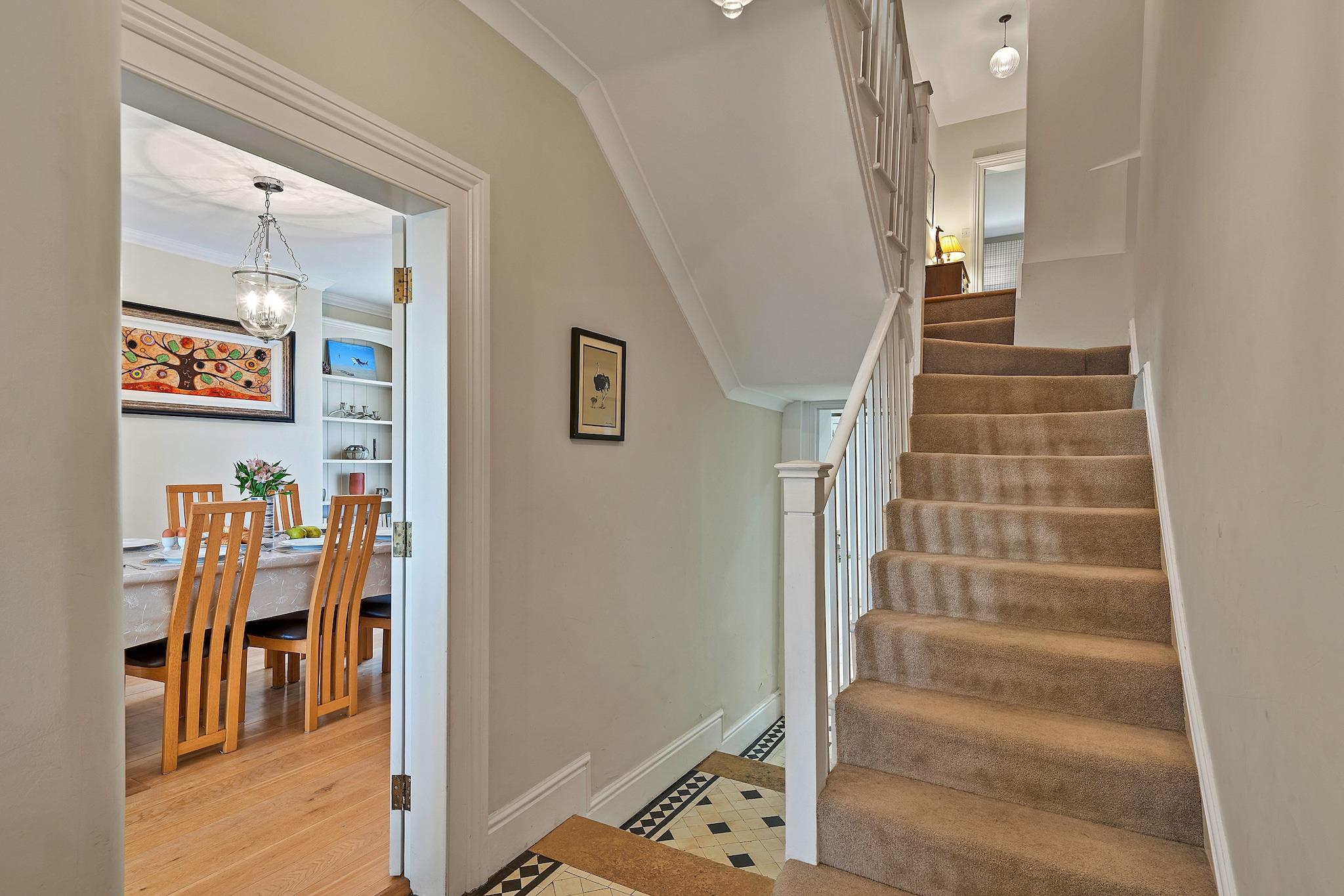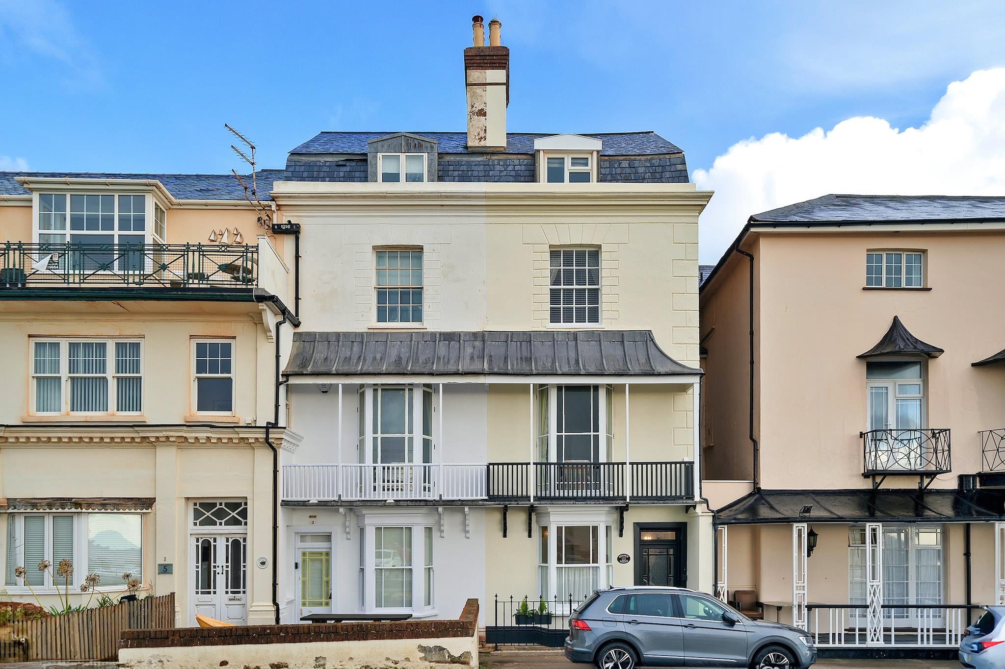 This elegant Regency villa offers a luxurious stay with spacious accommodation, ideal for families or groups. Featuring four bedrooms, including three king-size beds and one double, the property comfortably accommodates up to 8 guests. The open-plan ground floor includes a stylish living area with a TV and Wi-Fi, a large dining table for 8, and a well-equipped kitchen with a separate utility room. Guests can enjoy the private enclosed patio, perfect for dining al fresco or storing bicycles. The property is also conveniently located with a reserved parking space for one car, ensuring ease of access. Situated in the charming seaside town of Sidmouth, this property is perfectly positioned for exploring the natural beauty of the area. Guests can take in stunning views of Peak Hill and the sea from the first-floor balcony. The town offers a variety of local attractions, from beautiful beaches to vibrant shops, cafes, and restaurants. The property is just a short walk from public transport links, ensuring convenient access to nearby areas of interest. In addition to the charming living spaces, this home features a luxurious master bedroom with sea views and an en-suite shower room. The elegant décor extends throughout, with original features such as ornate coving and characterful fireplaces. The villa also offers additional amenities such as a washing machine and a secure parking space for one vehicle, providing all the comforts of home while surrounded by the beauty of Sidmouth.