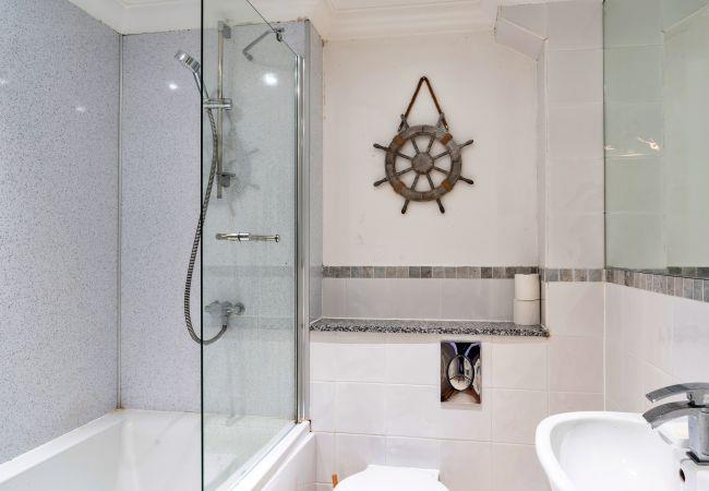 Inside, you’ll find a modern kitchen that is fully equipped for preparing delicious meals, which can be enjoyed in the adjacent dining area. The apartment includes two bedrooms: the master bedroom, with an en-suite shower room, offers a king-size bed with sea views, while the second bedroom, furnished with twin beds, provides easy access to a spacious family bathroom, complete with a shower and an L-shaped bath.