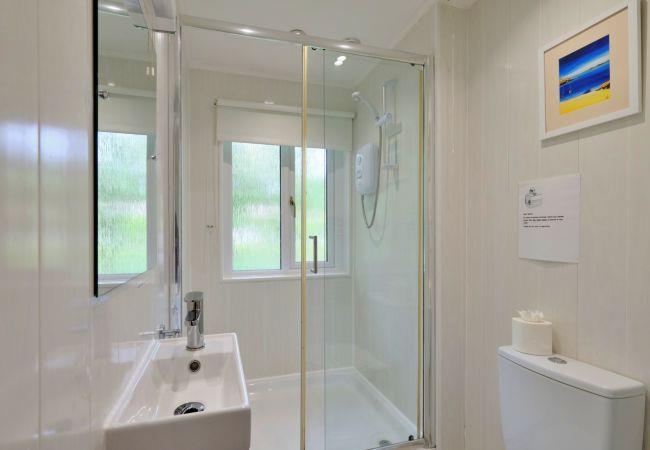 Bedroom one features a comfortable double bed, a hanging rail for storage, and a TV. Bedroom two offers two single beds, a hanging rail, and its own TV – ideal for children or friends sharing. The modern shower room includes a large shower cubicle, wash basin and a W/C.