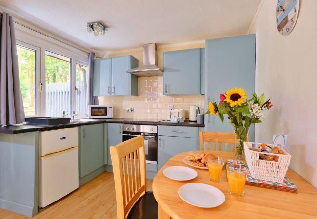 Step inside and you’ll find a bright open-plan living area, with a dining table seating up 4 four guests and a fully equipped kitchen featuring an electric hob and oven, microwave, and an under-counter fridge/freezer. Large windows and patio doors flood the space with natural light and lead directly to the terrace. Joyful Cottage also benefits from Wi-Fi.