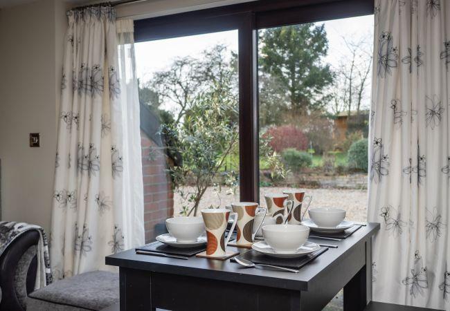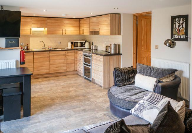 The open-plan living space is designed for and comfort, featuring a large sofa, cuddle chair, and a 40" Freeview TV with HDMI and USB ports. A table with four stools doubles as side tables when required, and a storage pouffe contains a selection of family games.