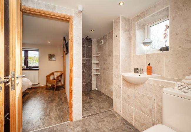The bathroom is fitted with a walk-in rainfall shower, a heated towel rail, and supplied towels. Connecting directly to both the main living area and the bedroom for convenience.