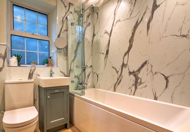 Upon entering The Cottage, to the left the reception area leads itself off to the open plan kitchen and dining area, with ample seating for all should you wish to cook up a feast from the fully equipped kitchen, however a host of cuisines are not too far away should you wish to dine in or have delivered. The marble work surfaces and centre island brings this kitchen up to a modern standard, whilst the exposed brick and features of old exudes charm and character.