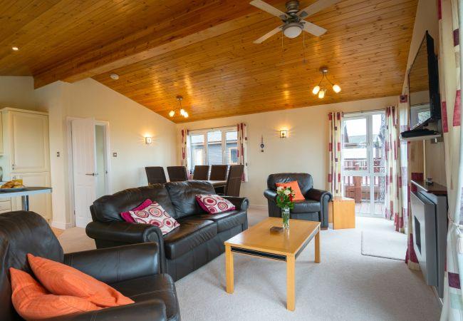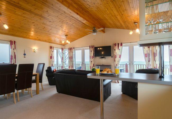 Within the lodge, there is a spacious bright open plan kitchen, living and dining area which is smartly furnished and has all the home comforts you will want to relax and enjoy your holiday. There is a television with DVD player, comfortable sofas, and a large dining table, perfect for coming together for family meals with a glorious sea view. The modern kitchen area has all the equipment and amenities you’ll need during your stay.